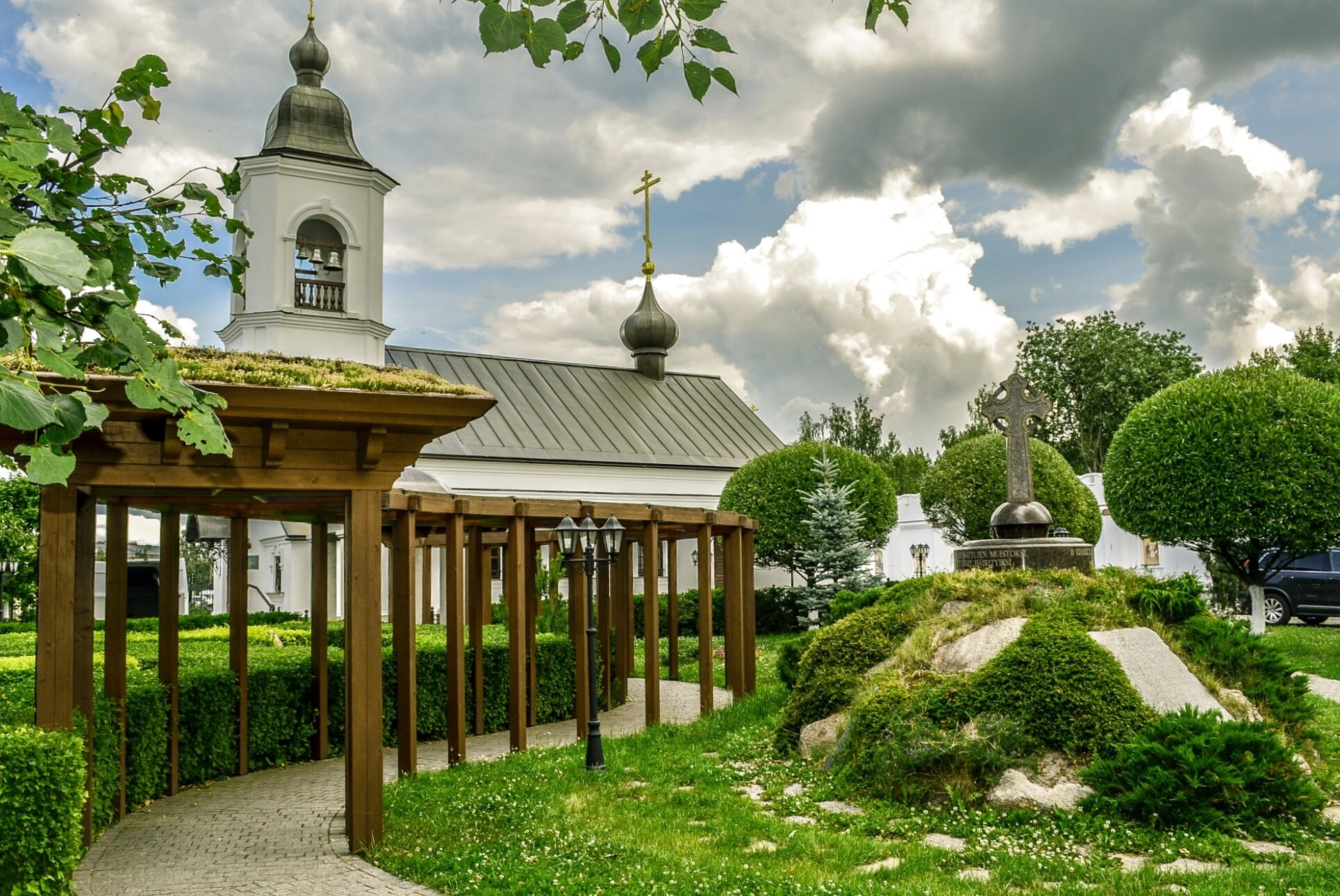 Доминантой кадра является высокая колокольня храма, увенчанная православным крестом. Колокольный звон, раздающийся с этой звонницы, созывает верующих на молитву и отмечает церковные праздники. Рядом с мощёными тропинками установлен памятник, увенчанный крестом, который, вероятно, является поклонным или памятным крестом, свидетельствующим о значимых событиях в истории прихода.