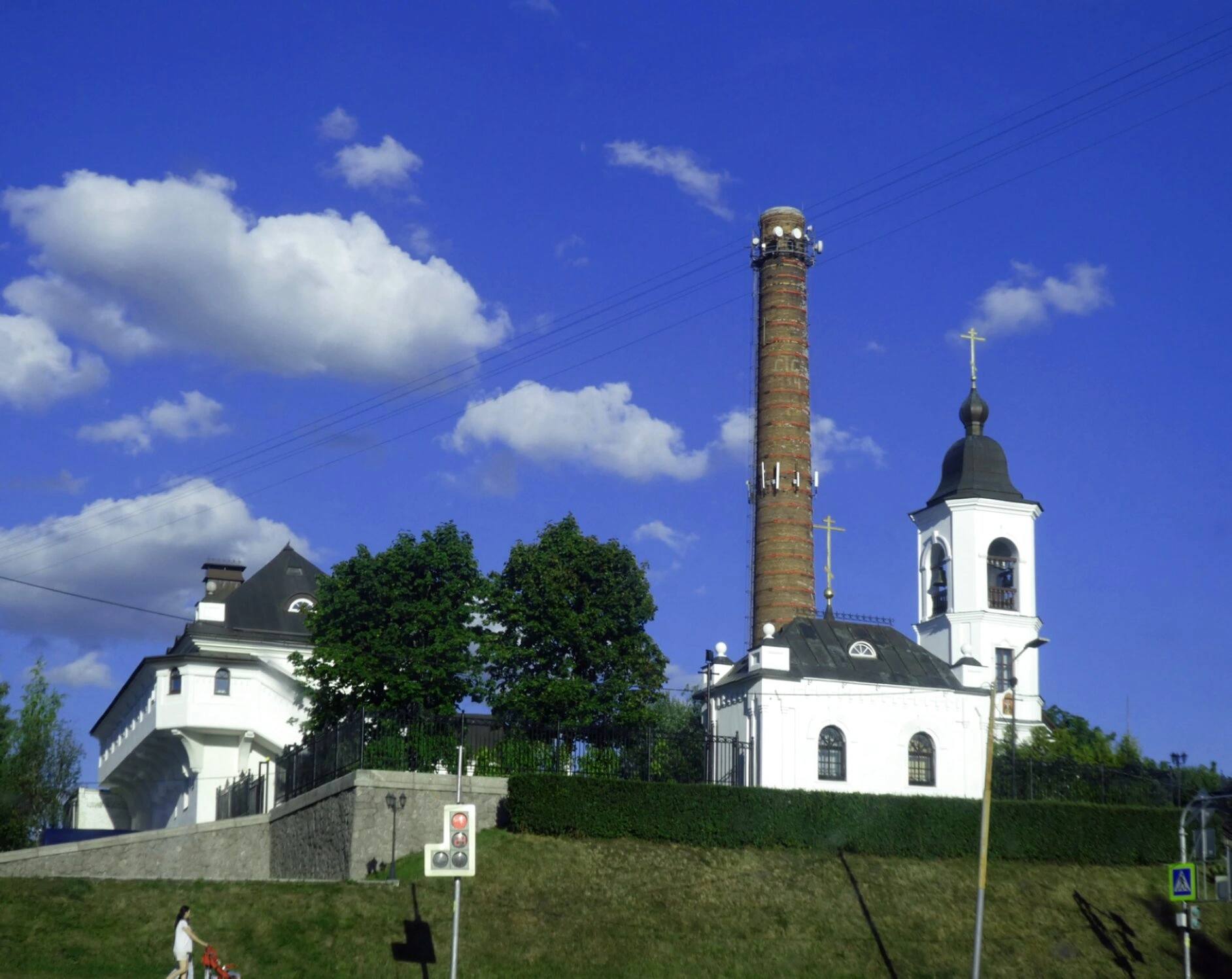 Рядом со святым местом видна высокая кирпичная труба, являющаяся частью исторической городской застройки и напоминающая о промышленном прошлом города. Прихрамовая территория благоустроена: видны ухоженные деревья и кустарники, а также часть городской дороги с элементами инфраструктуры — светофором и дорожным знаком, что гармонично сочетает духовную атмосферу с современной жизнью города.