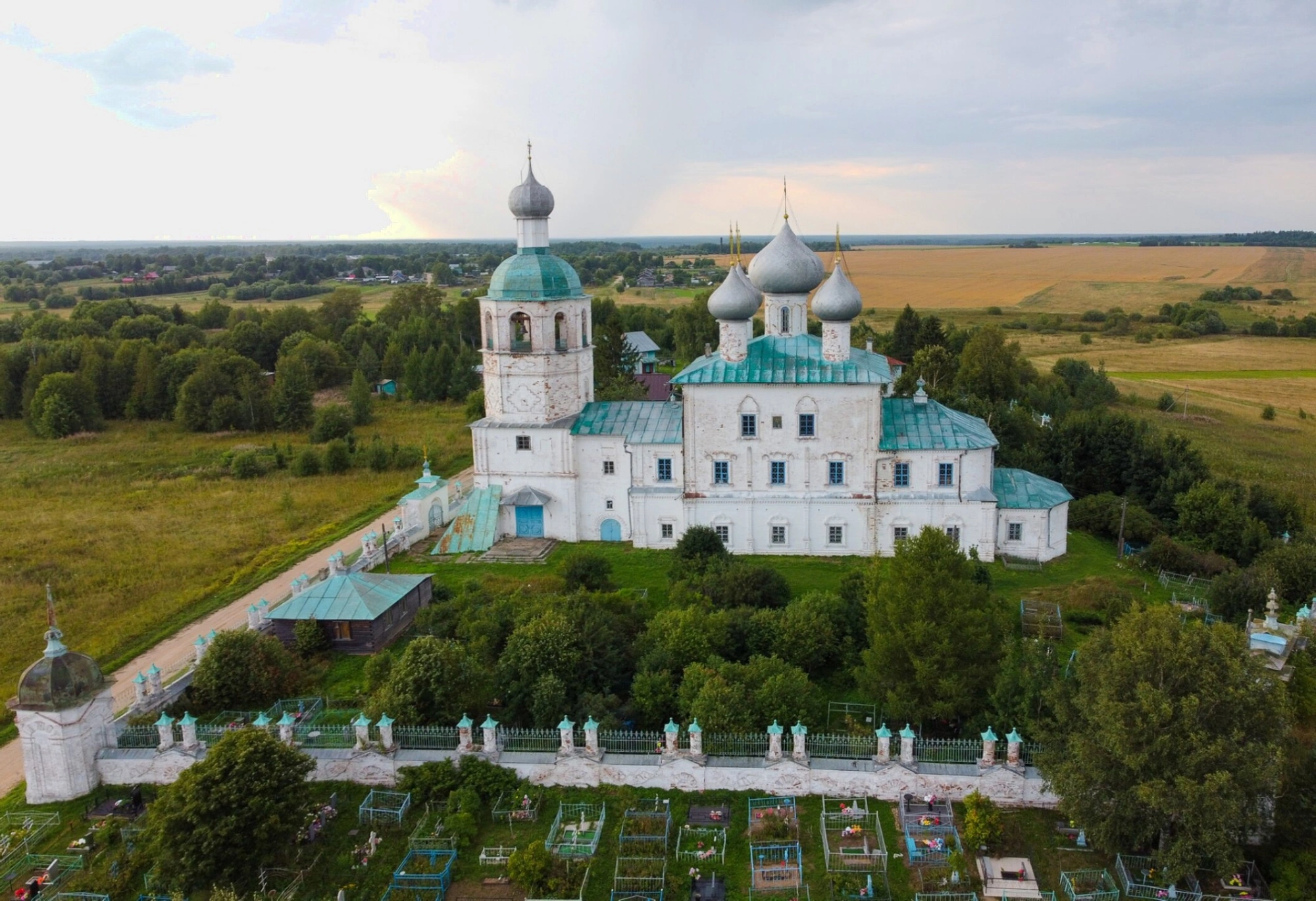 Белоснежный каменный храм представляет собой прекрасный образец православной церковной архитектуры, характерной для Русского Севера. Основной объём храма увенчан несколькими золочёными куполами, которые символизируют Господа Иисуса Христа и четырёх евангелистов. Рядом возвышается стройная колокольня, чей звон разносится над окрестными полями и лесами, созывая верующих на молитву.