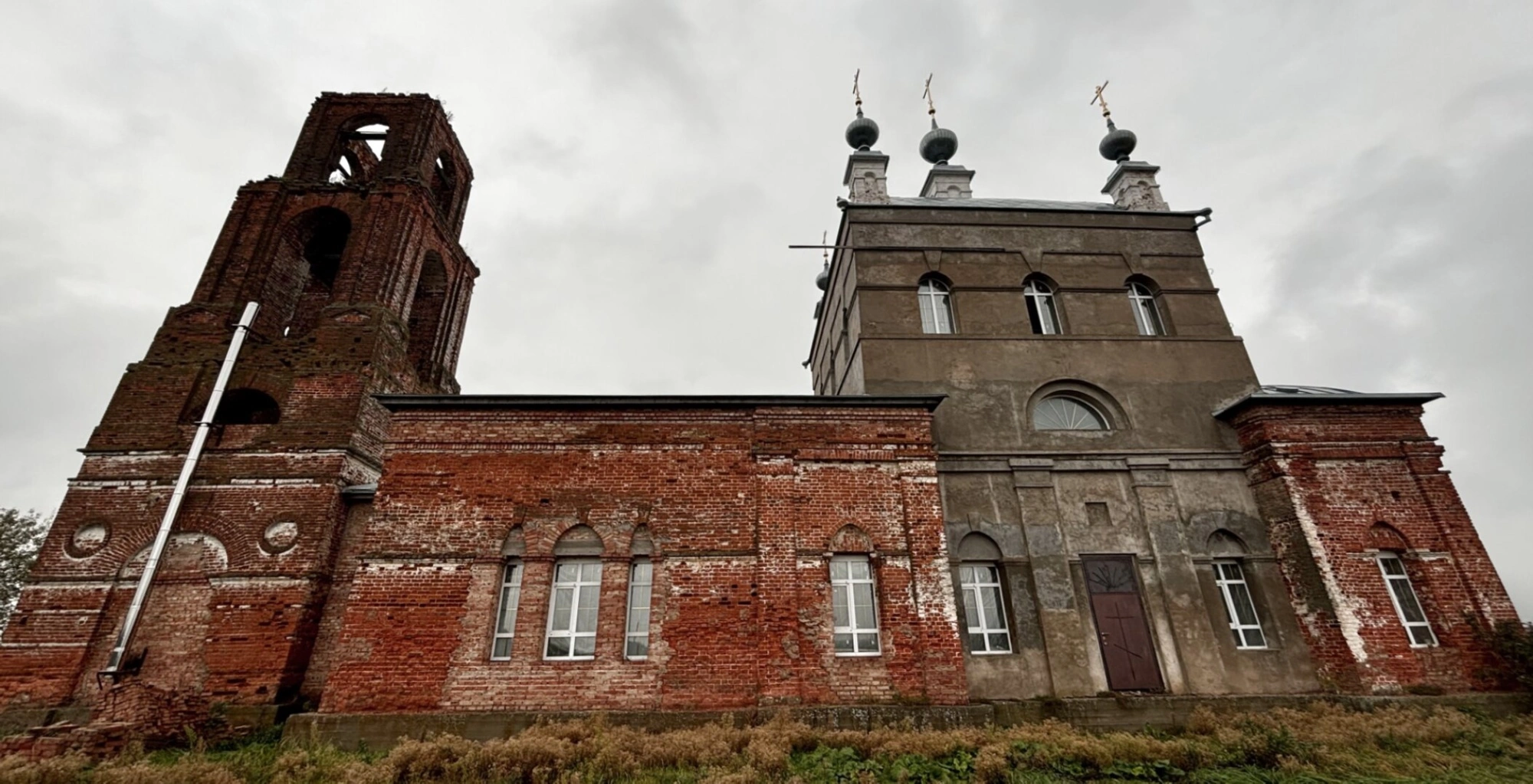 Вокруг основания храма наблюдается густая поросль травы и дикорастущих растений, что подчёркивает запустение. Пасмурная погода в момент съёмки усиливает общее впечатление утраты и ветхости от созерцания этого некогда благолепного места молитвы. Фотография представляет историко-документальный интерес, фиксируя состояние памятника церковной архитектуры в конкретный момент времени.