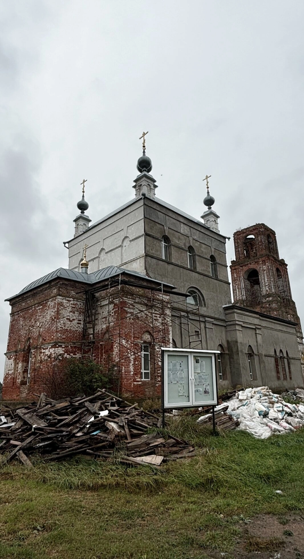 Рядом с основным зданием стоит разрушенная колокольня из красного кирпича, лишённая завершения, чьи арочные проёмы молчаливо свидетельствуют о былой гармонии. На переднем плане видны следы трудовой деятельности: деревянные доски, брёвна и мешки со строительными материалами. Перед входом установлен информационный стенд, а над дверью — временная металлическая лестница, что подтверждает активную фазу работ. Всё это происходит на фоне умиротворяющего пейзажа, где земля покрыта травой, а небо — слоистыми облаками.