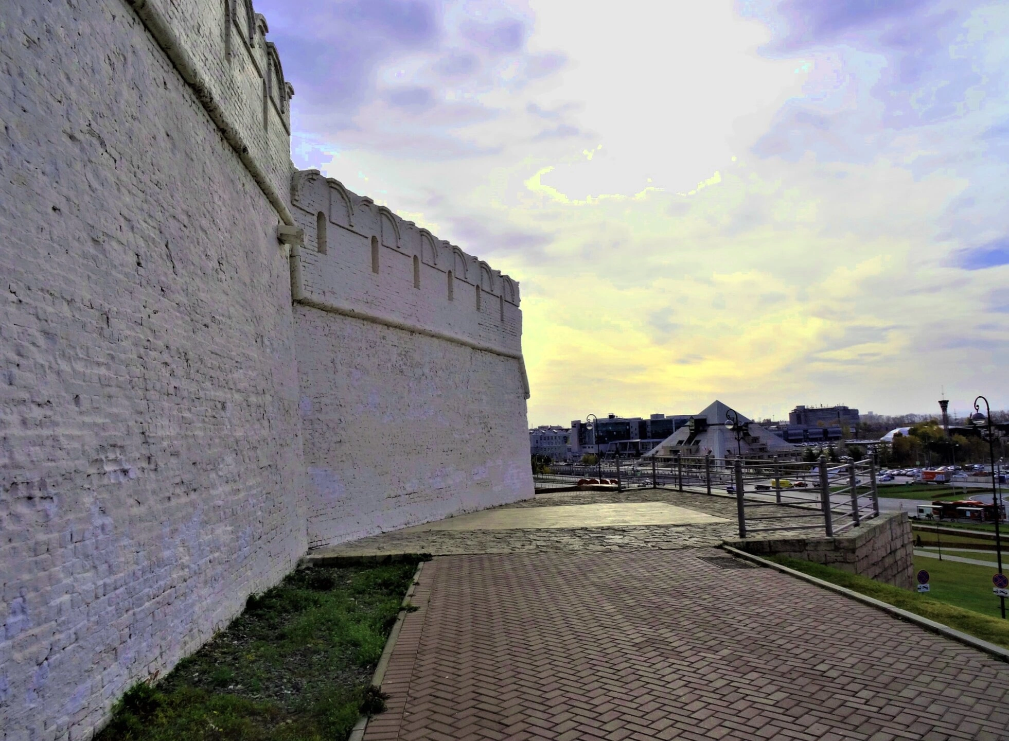 Фотография запечатлела часть беленого фасада древнего смоленского храма во имя святого апостола и евангелиста Иоанна Богослова, что на Варяжках. На снимке крупным планом показана округлая алтарная часть — апсида, чьи стены несут на себе отпечаток многовековой истории. Фасад храма, покрытый слоем побелки, демонстрирует два яруса оконных проёмов: внизу видны арочные окна, выше — окна с закруглённым верхом, характерные для архитектурных переделок более поздних столетий. У основания стены сквозь штукатурку проступает древняя плинфяная кладка XII века, напоминающая о первоначальном облике святыни. Вдоль стены тянется металлическая водосточная труба, а под ногами расстилается площадка, вымощенная кирпичом или брусчаткой. На заднем плане, за кронами деревьев, открывается панорама современного Смоленска, контрастирующая с древней церковью, а над всем этим возвышается серое пасмурное небо.