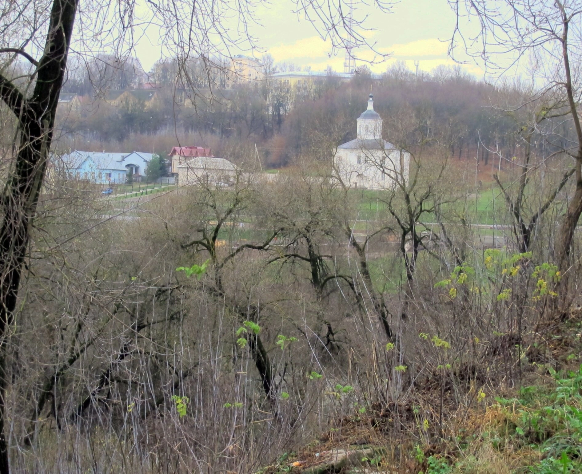 На представленной фотографии запечатлён вид на один из древнейших православных храмов России — церковь святого апостола и евангелиста Иоанна Богослова, что на Варяжках в Смоленске. Снимок сделан в осенне-зимний период с возвышенности, откуда открывается панорама на этот уникальный памятник домонгольского зодчества и окружающий его мирный городской пейзаж.