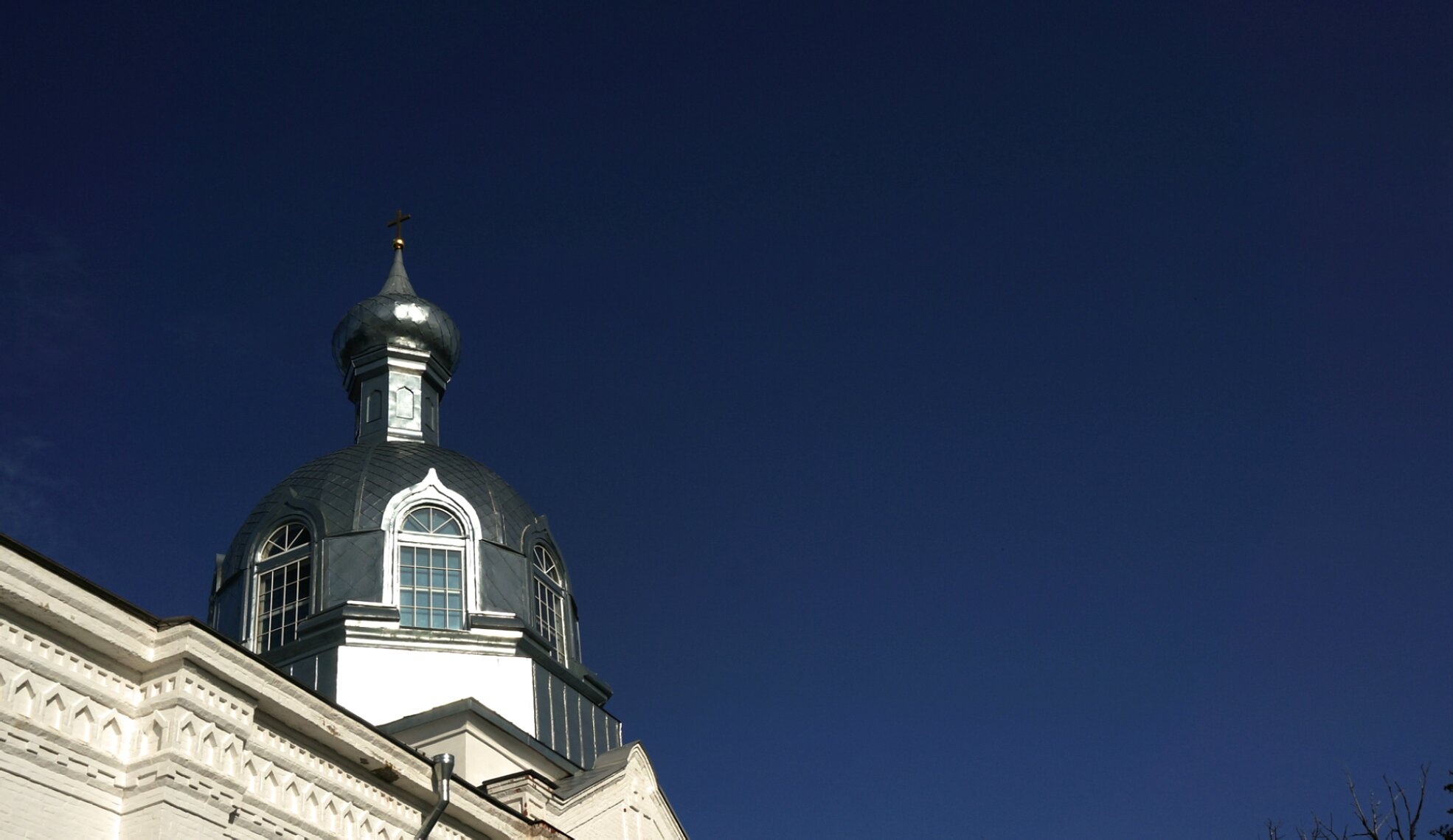 На представленной фотографии запечатлён фрагмент архитектуры православного храма в городе Новая Ладога. Снимок демонстрирует величественный купол церкви Иоанна Богослова, ныне освящённой в честь Рождества Пресвятой Богородицы. Серебристое покрытие купола характерной луковичной формы символизирует небесную славу и горний мир. Венчающий композицию крест утверждает победу жизни над смертью и напоминает о искупительной жертве Спасителя.