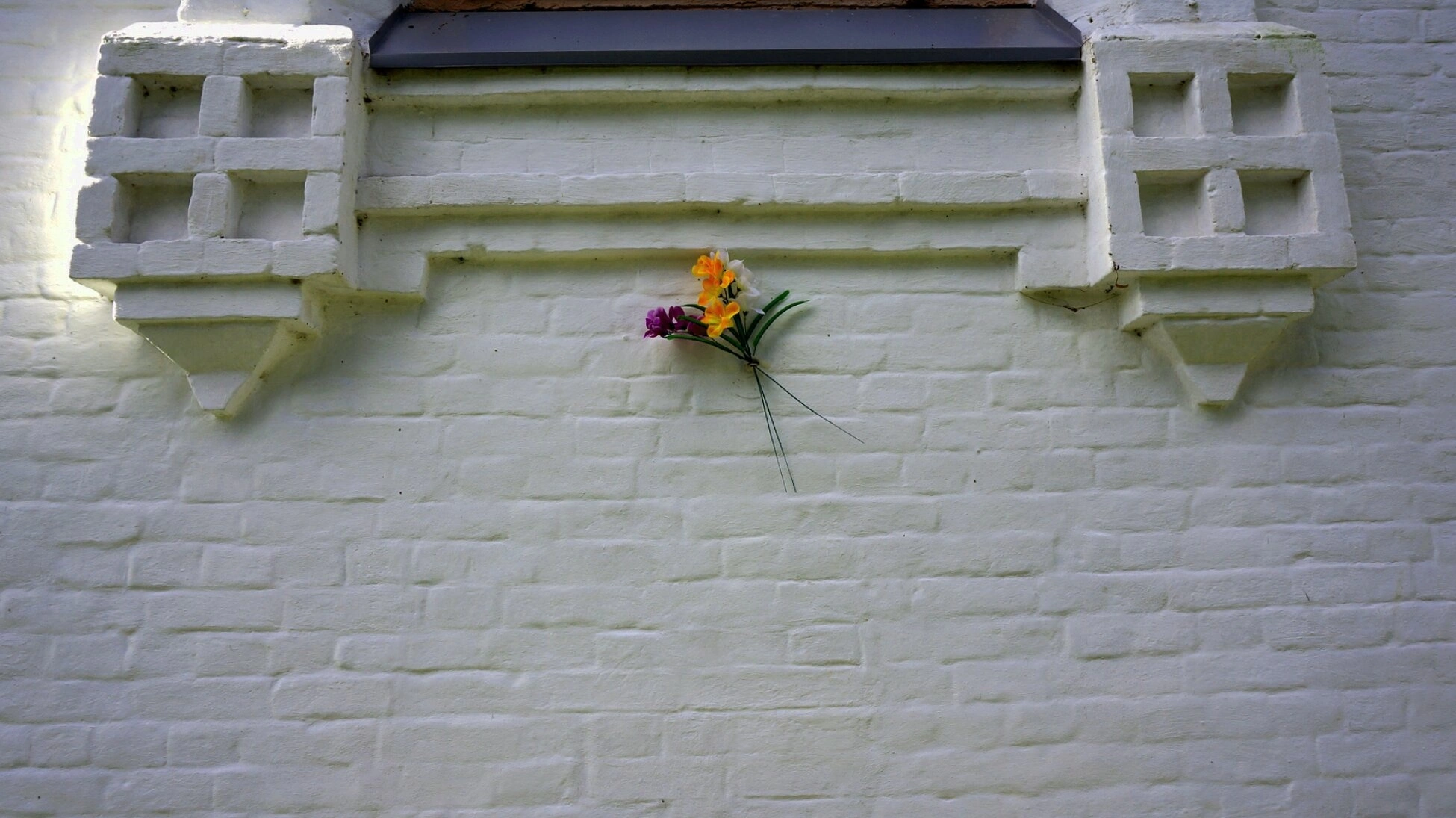 Особого внимания заслуживает небольшой букет цветов, размещённый в центре композиции под козырьком. Оранжевые и фиолетовые цветы создают трогательный контраст с белизной стены, привнося в строгий церковный облик элемент живой природы и символизируя красоту Божьего творения.