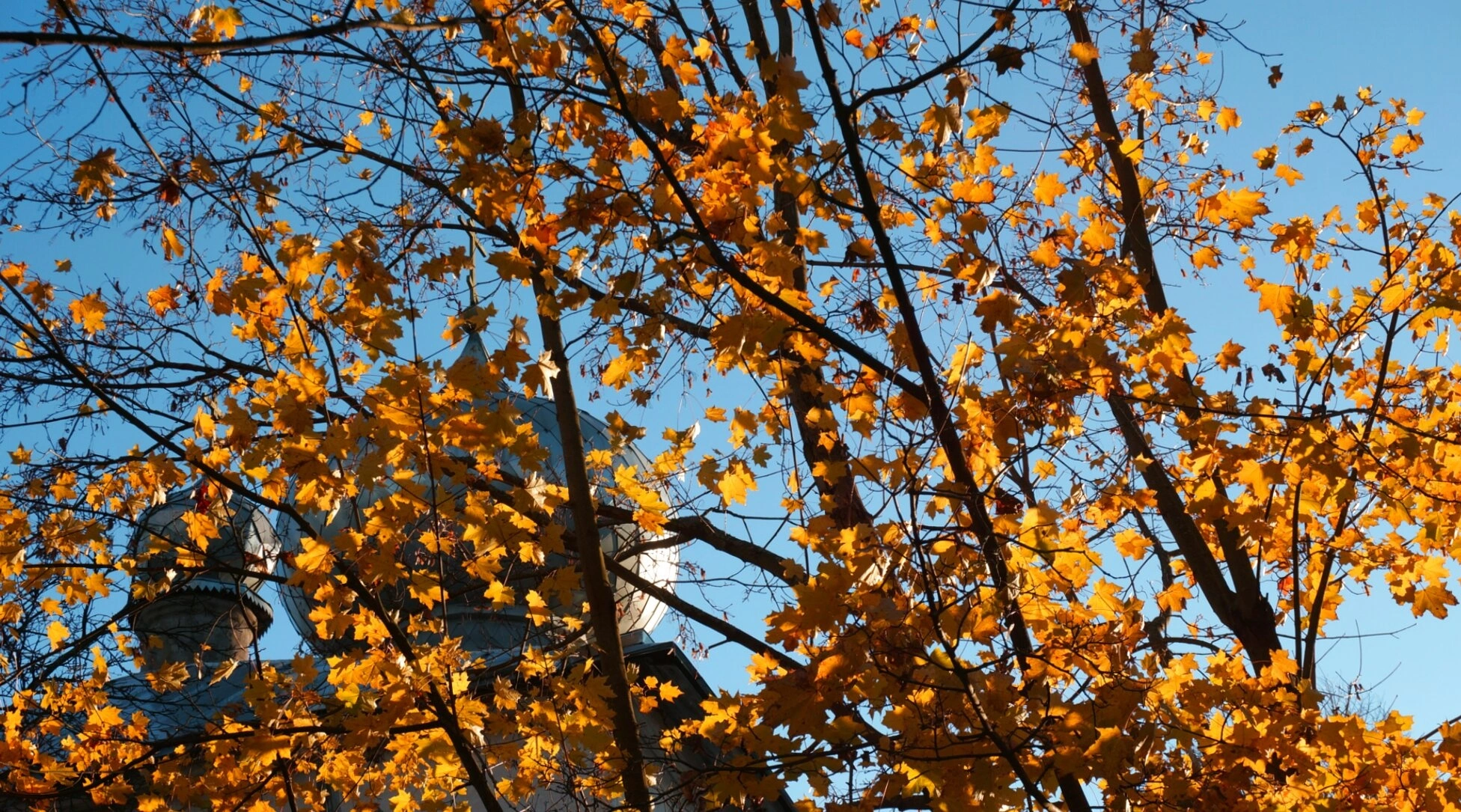 Церковь Иоанна Богослова, также известная как храм Рождества Пресвятой Богородицы, представляет собой значимый памятник православной культуры. Исторический храм, укрытый осенней листвой, символизирует единение божественного творения и природной красоты. Данная фотография передает особую атмосферу духовного умиротворения и благоговения перед святыней.