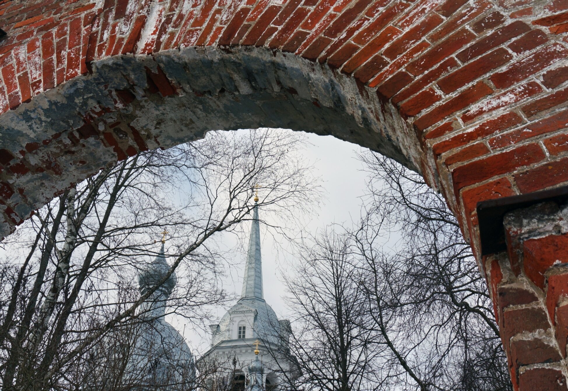 Сквозь арочный проем открывается вид на верхнюю часть церковного здания, выполненного в светлых тонах и увенчанного высоким шпилем с золоченым куполом и православным крестом. Архитектура храма характерна для русского церковного зодчества XVIII-XIX веков. Голые ветви деревьев на переднем плане создают естественное обрамление, подчеркивая гармонию божественного творения и природного мира.