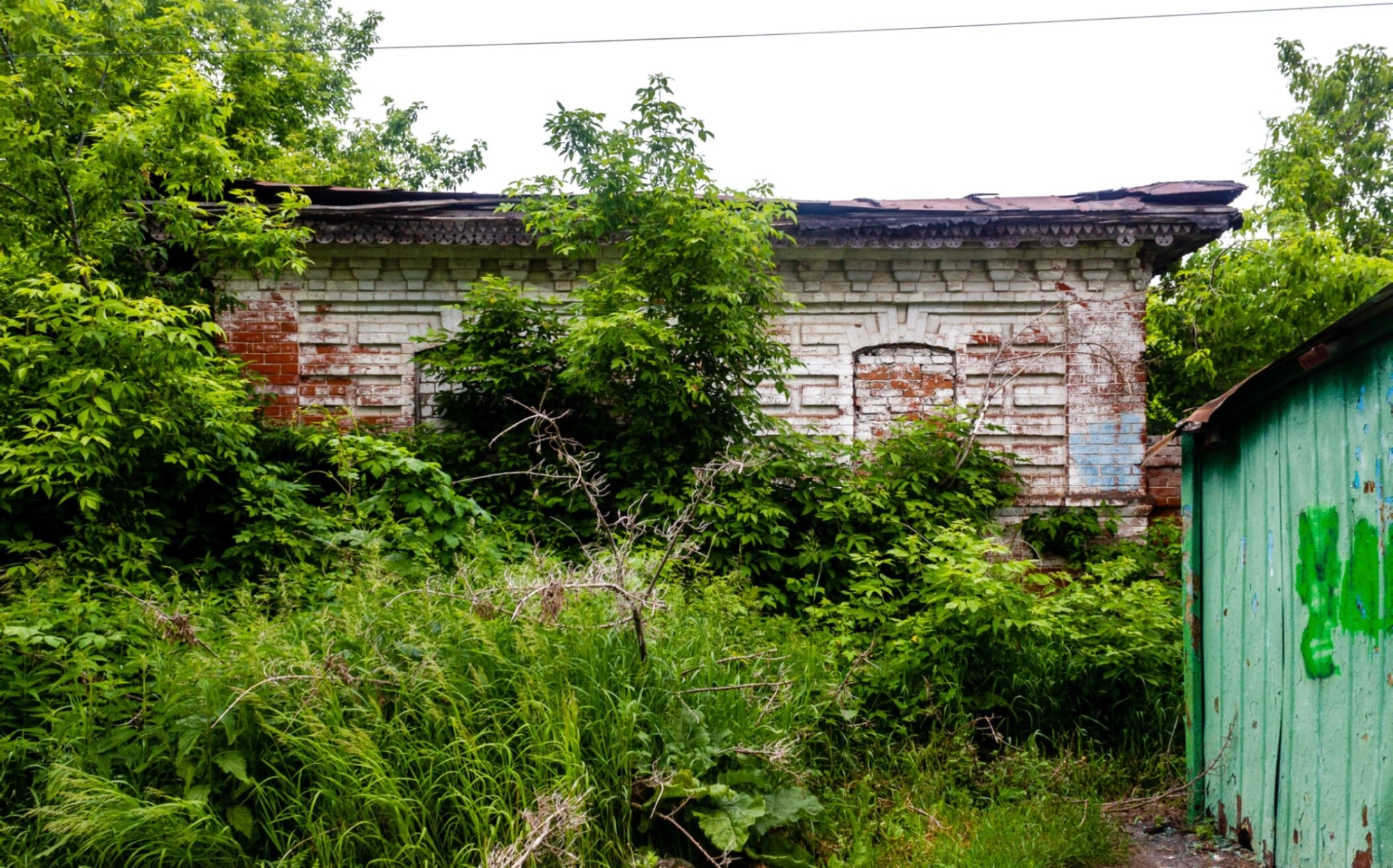На переднем плане фотографии видна высокая луговая трава, подступающая к самым стенам церкви, а справа от храма просматривается фрагмент зеленой хозяйственной постройки. Природа постепенно возвращает себе территорию, когда-то освященную молитвами прихожан, создавая одновременно печальное и величественное зрелище забвения былой духовной жизни.