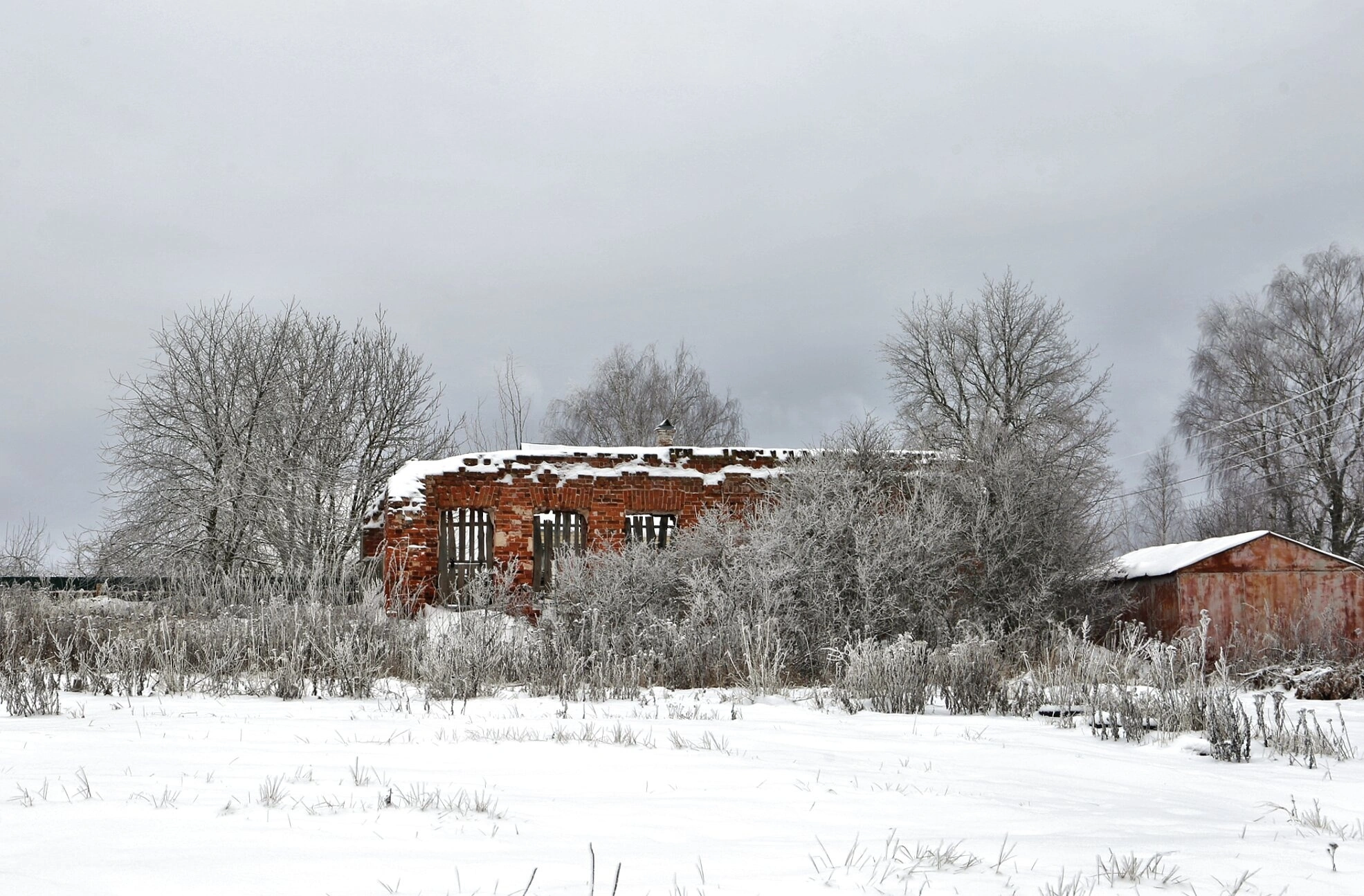 Снимок сделан в зимнее время, когда природа облачилась в белоснежные одежды. Пушистый снег покрыл землю вокруг руин и остатки стен, а деревья и кустарники украсились искристым инеем, создавая пронзительный контраст между вечной красотой Божьего мира и тленностью земных творений. Справа от основного здания церкви просматривается небольшое хозяйственное строение, вероятно, относящееся к периоду функционирования храма.