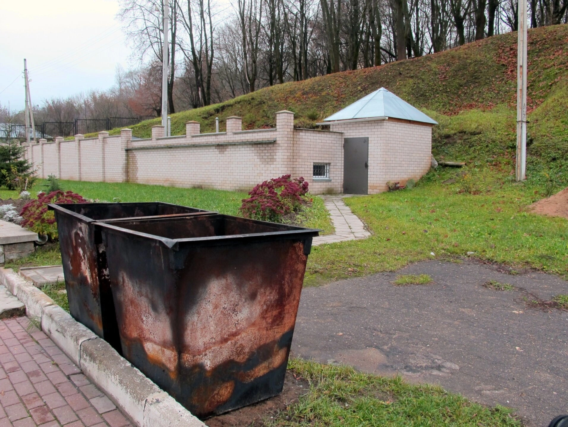 На представленной фотографии запечатлена территория, прилегающая к храму Иоанна Богослова в Смоленске. Снимок сделан в непосредственной близости от древней церкви, основанной в 1173 году по указу князя Романа Ростиславича. На переднем плане изображены два металлических контейнера для мусора, которые, вероятно, используются для хозяйственных нужд. За ними протянулась белая кирпичная стена, а в центре её расположено одноэтажное кирпичное строение, встроенное в склон холма. Это строение, возможно, является вспомогательным помещением церковного комплекса.