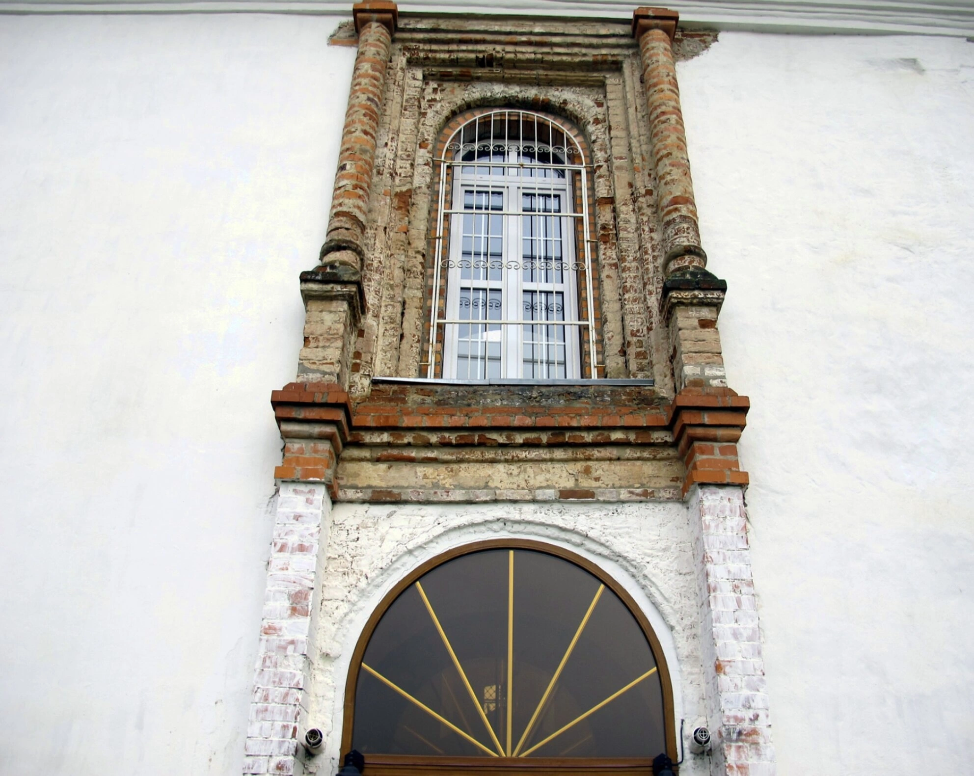 На представленной фотографии запечатлен фрагмент стены одного из древнейших православных храмов России – церкви святого апостола Иоанна Богослова в Смоленске. Кадр раскрывает участок белой оштукатуренной стены, на котором вертикально расположены два арочных проема. Верхний проем представляет собой арочное окно, обрамленное декоративным наличником из красного кирпича с элементами, напоминающими колонны. Окно оборудовано белой рамой и защитной металлической решеткой. Нижний проем, вероятно, является частью входа или большого окна; его полукруглая верхняя часть украшена веерообразным рисунком из золотистых линий, а кирпичная кладка вокруг окрашена в белый цвет. Композицию завершает выразительный контраст между гладкой белой штукатуркой стены и фактурным красным и белым кирпичом обрамлений.