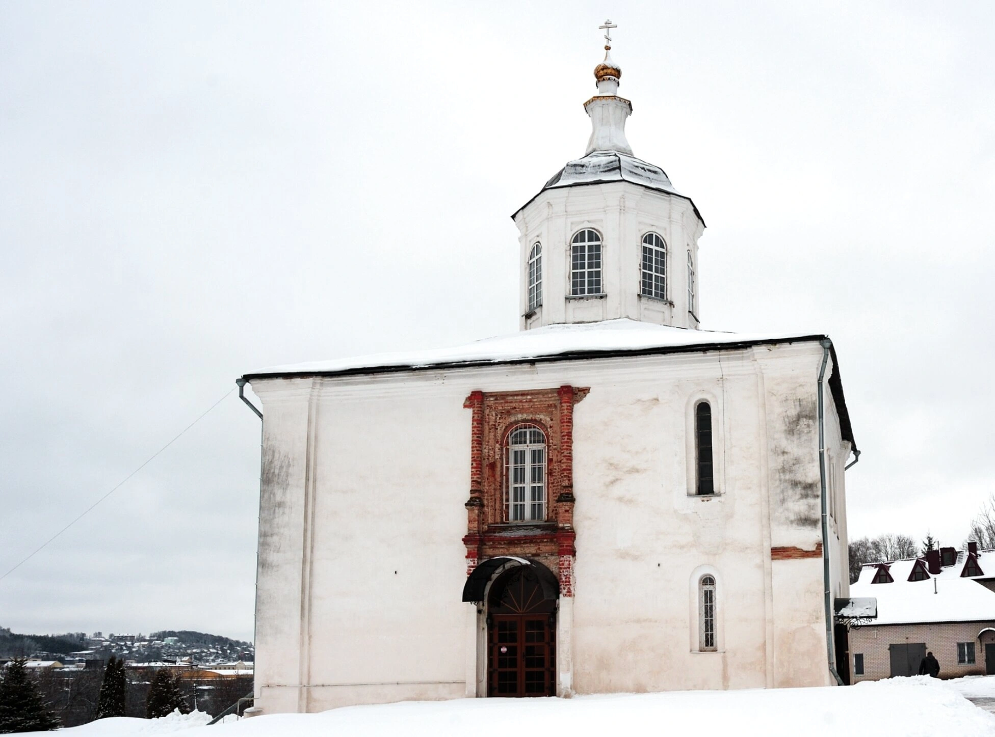 Зимний снимок передаёт особую, созерцательную атмосферу этого места. Земля и крыши построек покрыты ровным снежным покровом, справа к церкви примыкает одноэтажное здание с тёмной крышей. На заднем плане виднеются заснеженные деревья и холмы. Отсутствие людей на фотографии позволяет полностью сосредоточить внимание на величественной архитектуре древнего храма, который, несмотря на все исторические потрясения, продолжает стоять на смоленской земле как свидетель веры и мастерства древних зодчих.