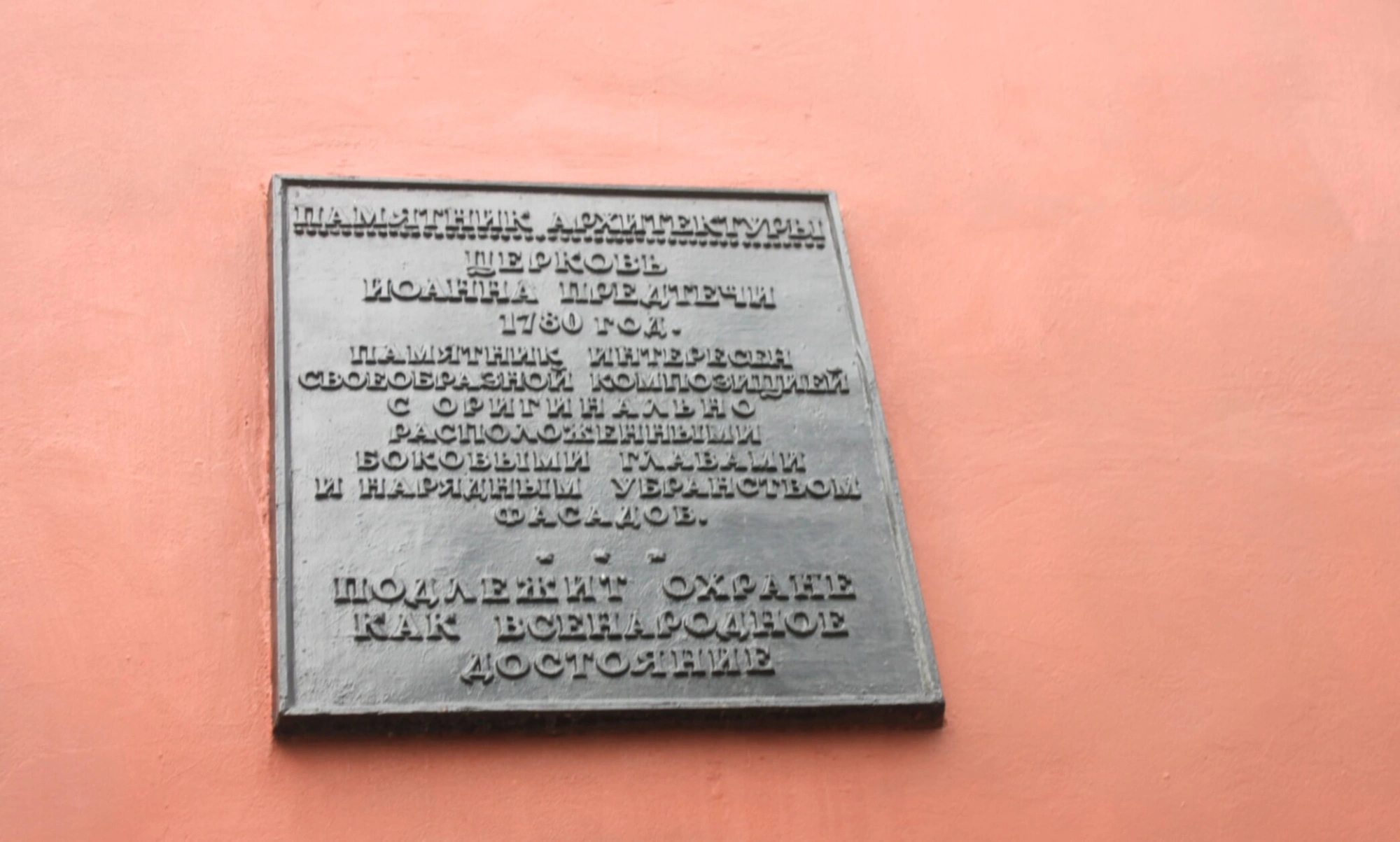 На фотографии запечатлена бронзовая мемориальная доска, установленная на стене храма Иоанна Предтечи в Калуге. Эта доска свидетельствует о статусе объекта как памятника архитектуры федерального значения, подлежащего охране как всенародное достояние. Церковь была построена в 1780 году и представляет собой выдающийся образец церковного зодчества.