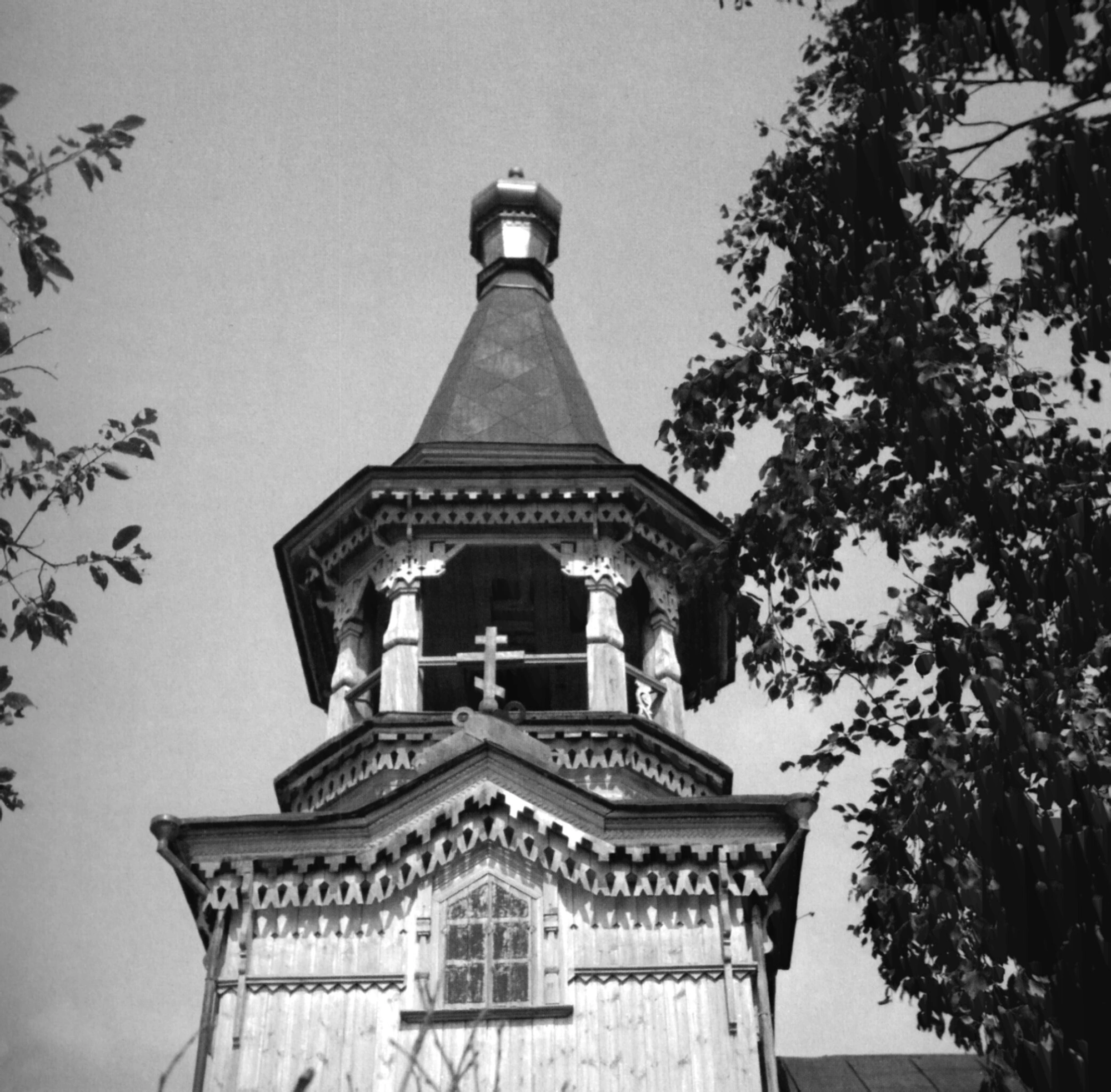 На представленной черно-белой фотографии запечатлена верхняя часть деревянной церкви во имя святого Пророка, Предтечи и Крестителя Господня Иоанна, расположенной в деревне Леликово Великогубского сельского поселения Республики Карелия. Храм находится по географическим координатам 61.980491 северной широты и 35.154579 восточной долготы, что соответствует историческому Заонежскому полуострову.