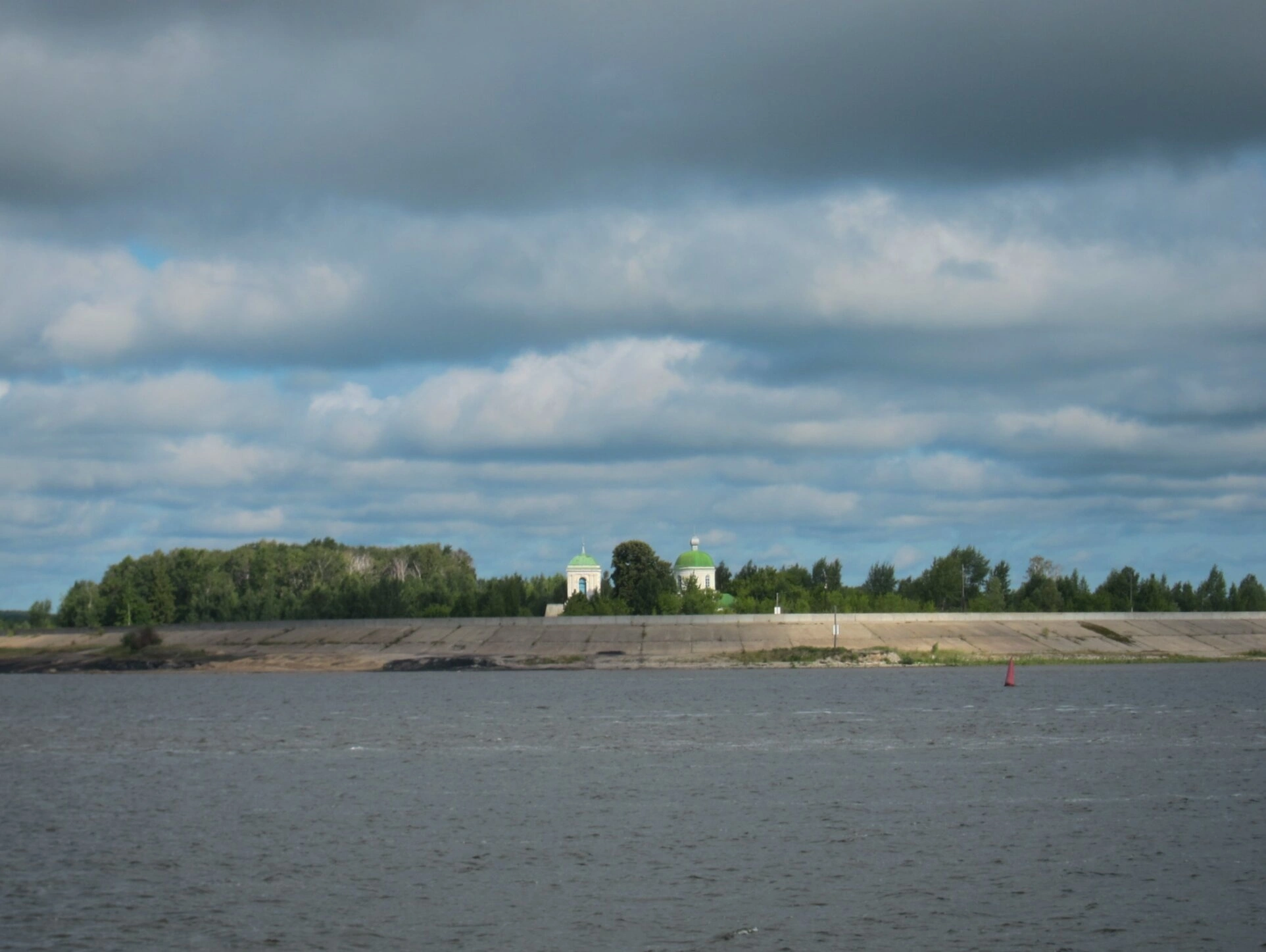 Снимок выполнен с водной поверхности, что позволяет оценить стратегически удачное расположение храма на высоком берегу. Береговая линия укреплена, что обеспечивает сохранность исторического сооружения. На переднем плане фотографии видна широкая водная гладь, по которой плывет красный буй, добавляющий цветовой акцент в общую композицию.