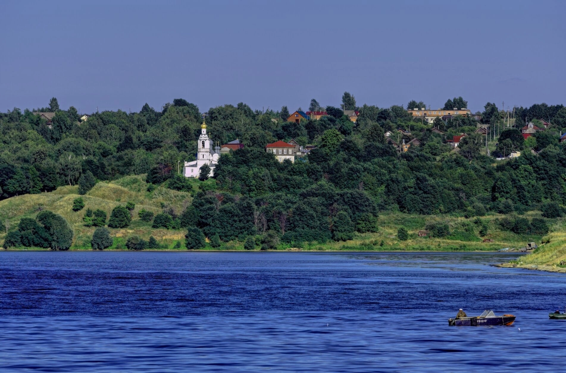 Фотография выполнена с акватории реки Волги, что позволяет оценить величественное расположение храма на возвышенности. На переднем плане изображена широкая водная гладь великой русской реки, где виднеются две маломерные лодки. В одной из них различима фигура человека, однако она находится на значительном расстоянии и не является основным объектом съемки.