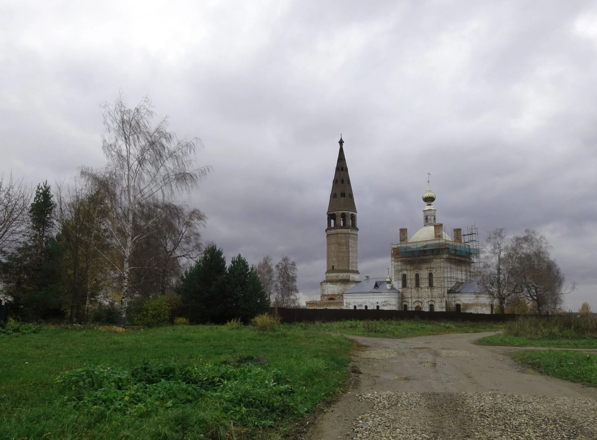 Храм окружён скромной северной природой: оголённые ветви берёз указывают на межсезонье, а грунтовая дорога ведёт прямо к его вратам. Пасмурное, затянутое облаками небо придаёт всей композиции настроение тишины, благоговения и светлой печали, напоминая о быстротечности земной жизни и вечности горнего мира. Эта фотография является ценным документом, фиксирующим состояние памятника православной культуры в его естественном природном окружении.