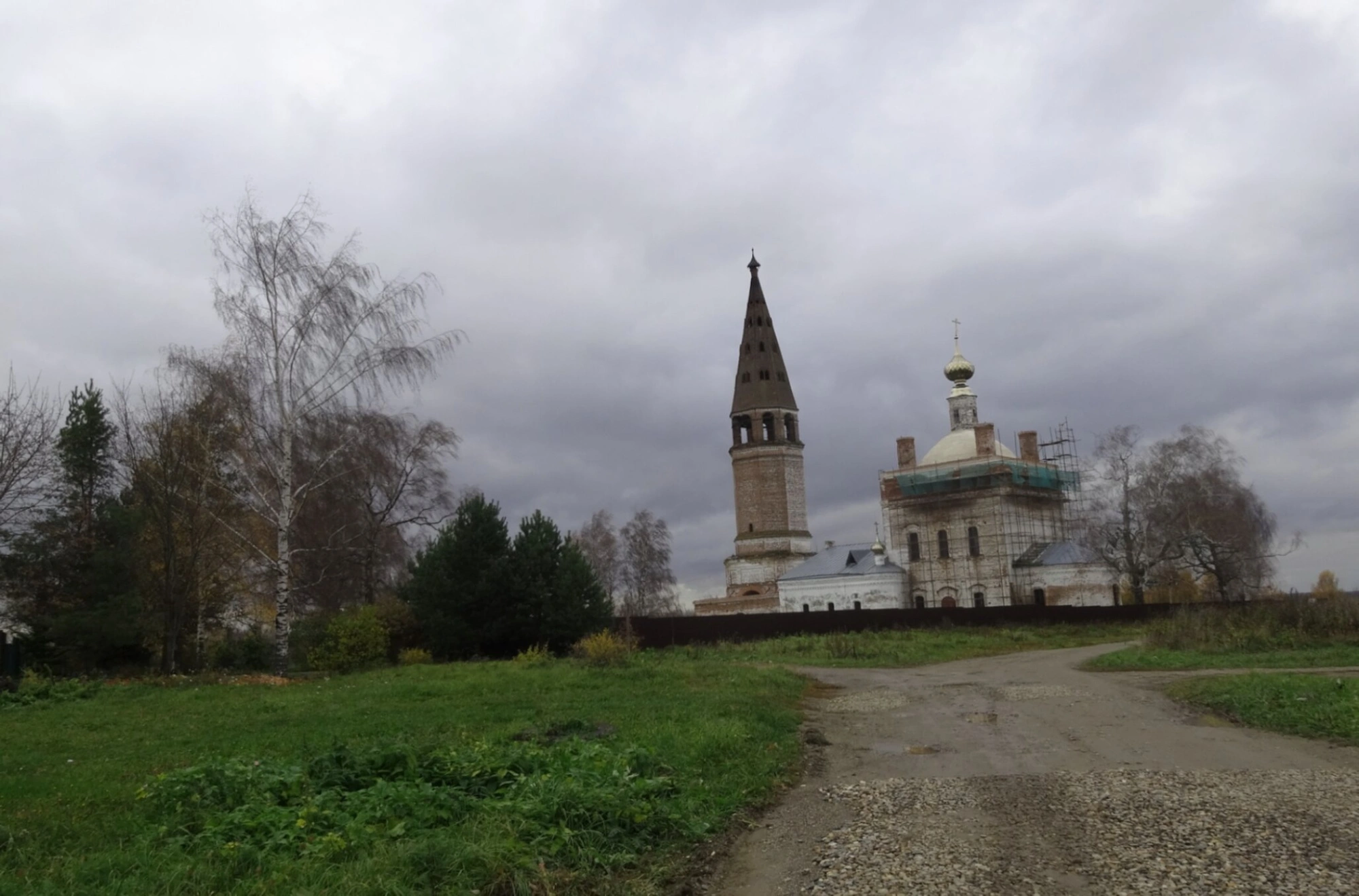 На снимке хорошо просматривается архитектурный ансамбль, характерный для православного зодчества Верхнего Поволжья второй половины XVII столетия. Доминантой комплекса является высокая шатровая колокольня, устремлённая в небо. Основной объём храма увенчан традиционным куполом, который в момент съёмки был окружён строительными лесами, что свидетельствует о ведущихся реставрационных работах по восстановлению святыни.