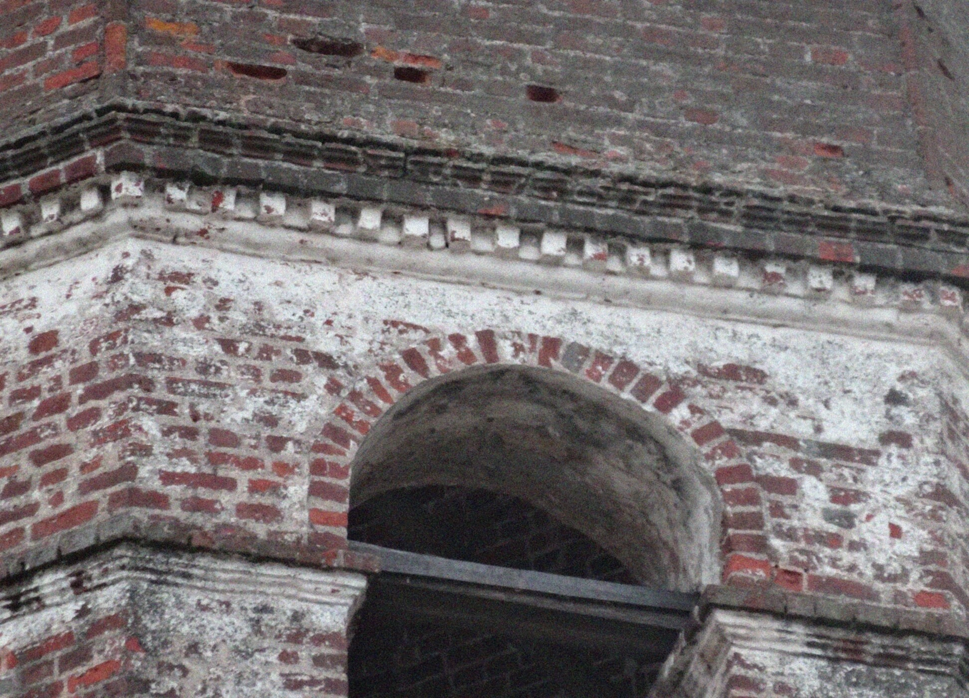 На снимке отчетливо видна массивная кирпичная кладка стены, сохранившая свою монолитность несмотря на следы естественного выветривания и воздействия времени. В левой части композиции расположен арочный оконный проем, характерный для церковного зодчества. Его прямоугольная форма, увенчанная кирпичной аркой, предназначена для освещения внутренних помещений храма и придает фасаду строгое и благолепное оформление.