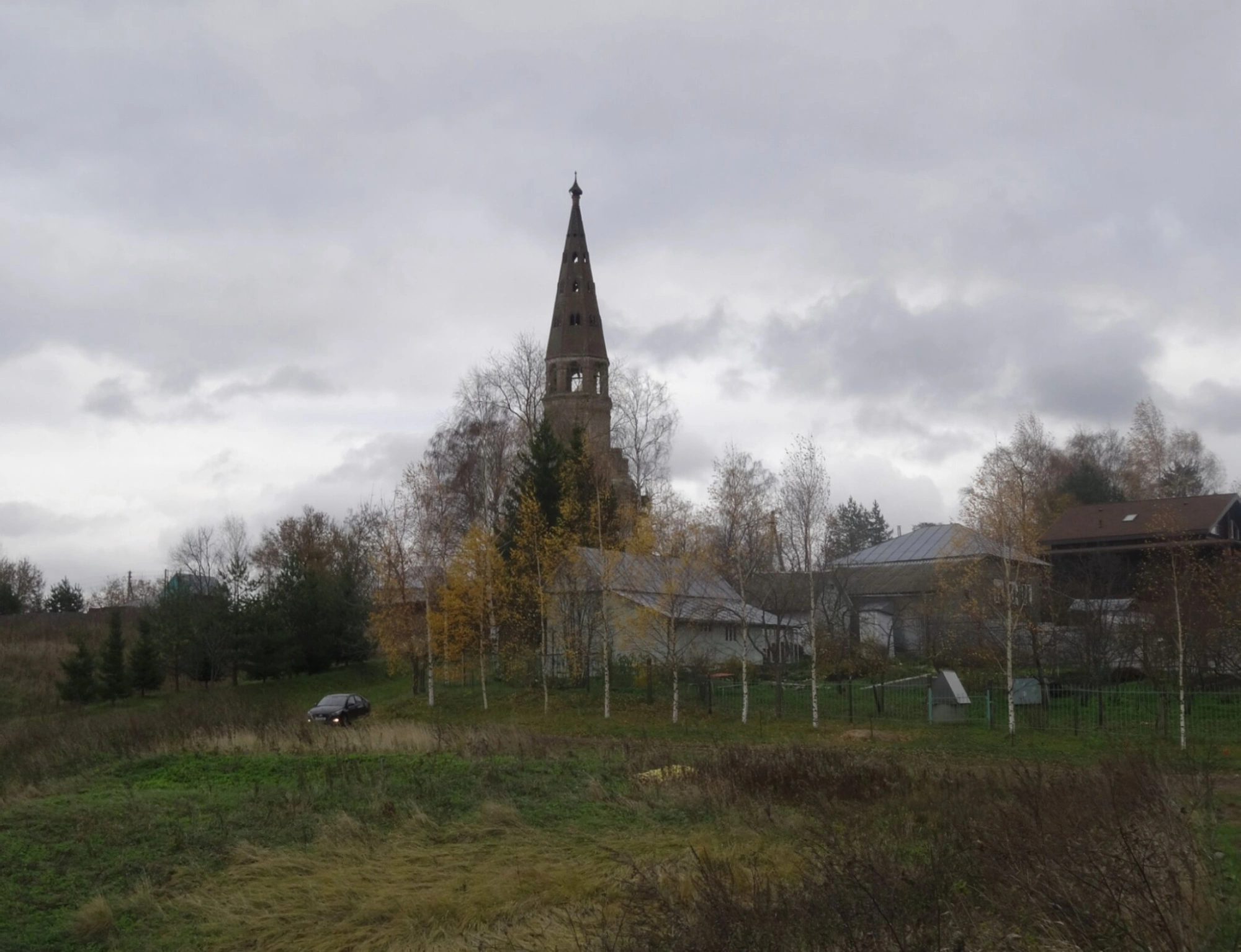 На фотографии запечатлён осенний вид на колокольню храма в честь святого Пророка, Предтечи и Крестителя Господня Иоанна в селе Шухтомаш Шуйского района Ивановской области. Высокий шпилеобразный завершение колокольни, устремлённое в небо, доминирует над окружающим пейзажем, символизируя духовную устремлённость к горнему миру.