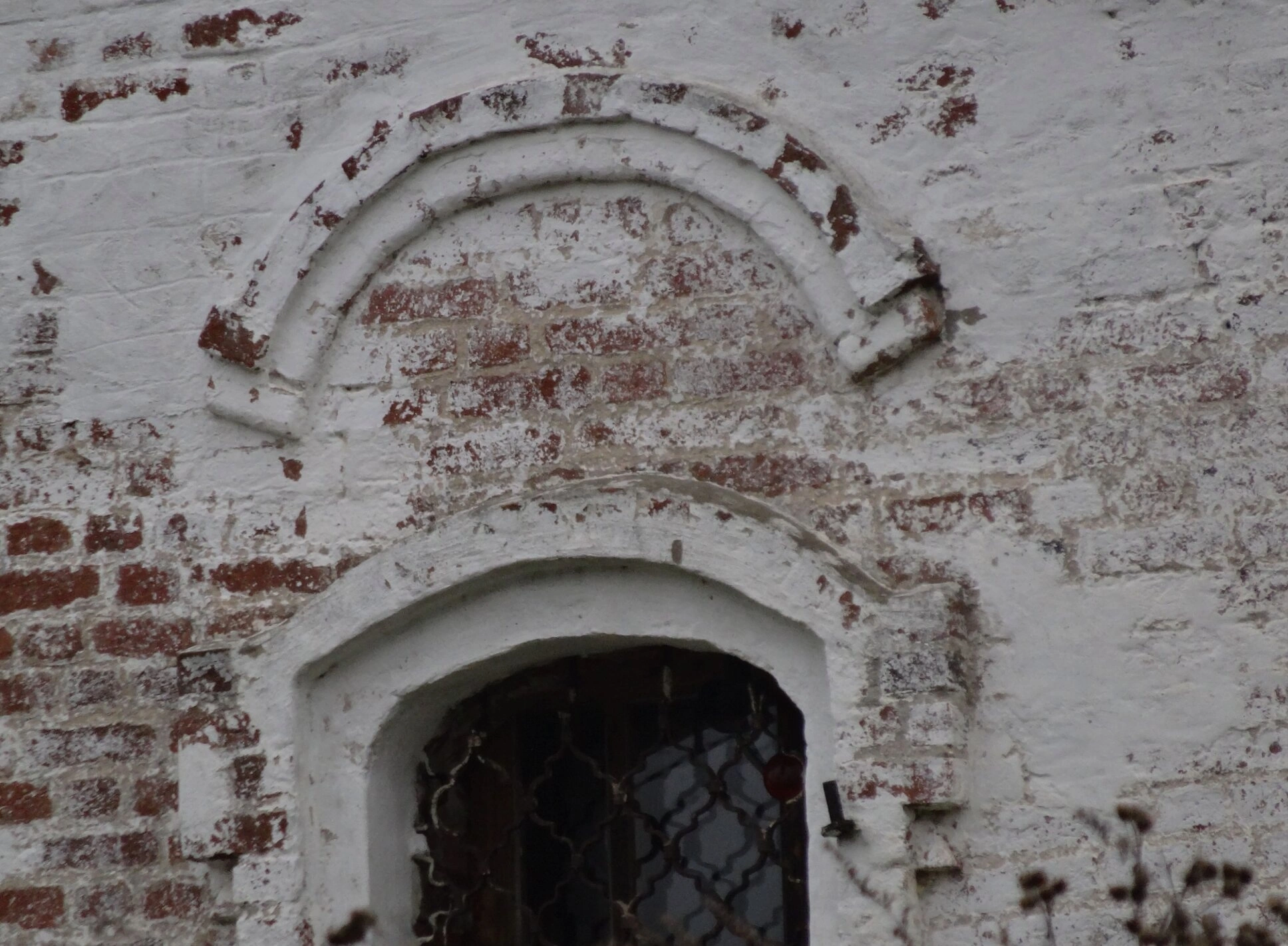 Над оконным проёмом взгляд обращается к декоративной полукруглой арке, искусно выложенной из кирпича и также сохранившей следы побелки. Эта деталь подчёркивает традиционный для церковной архитектуры стиль, стремящийся к возвышенности и благолепию. Частичное облупившееся покрытие обнажает древний материал, позволяя наблюдать почтенный возраст святого сооружения и свидетельствуя о необходимости его попечения и сохранения.