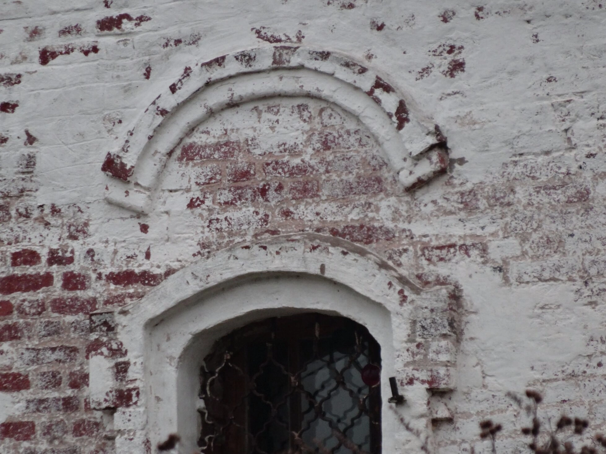 На представленной фотографии запечатлен фрагмент стены храма Иоанна Предтечи, расположенного в селе Шухомош Ивановской области. Святыня представляет собой выдающийся образец православной церковной архитектуры, демонстрирующий традиционные приемы древнерусского зодчества. Стена выполнена из красного керамического кирпича, частично покрытого штукатурным слоем и побелкой, что характерно для храмовых построек XIX века. Многослойное покрытие обеспечивало защиту несущих конструкций от воздействия атмосферных осадков и температурных перепадов, характерных для центрального региона России.