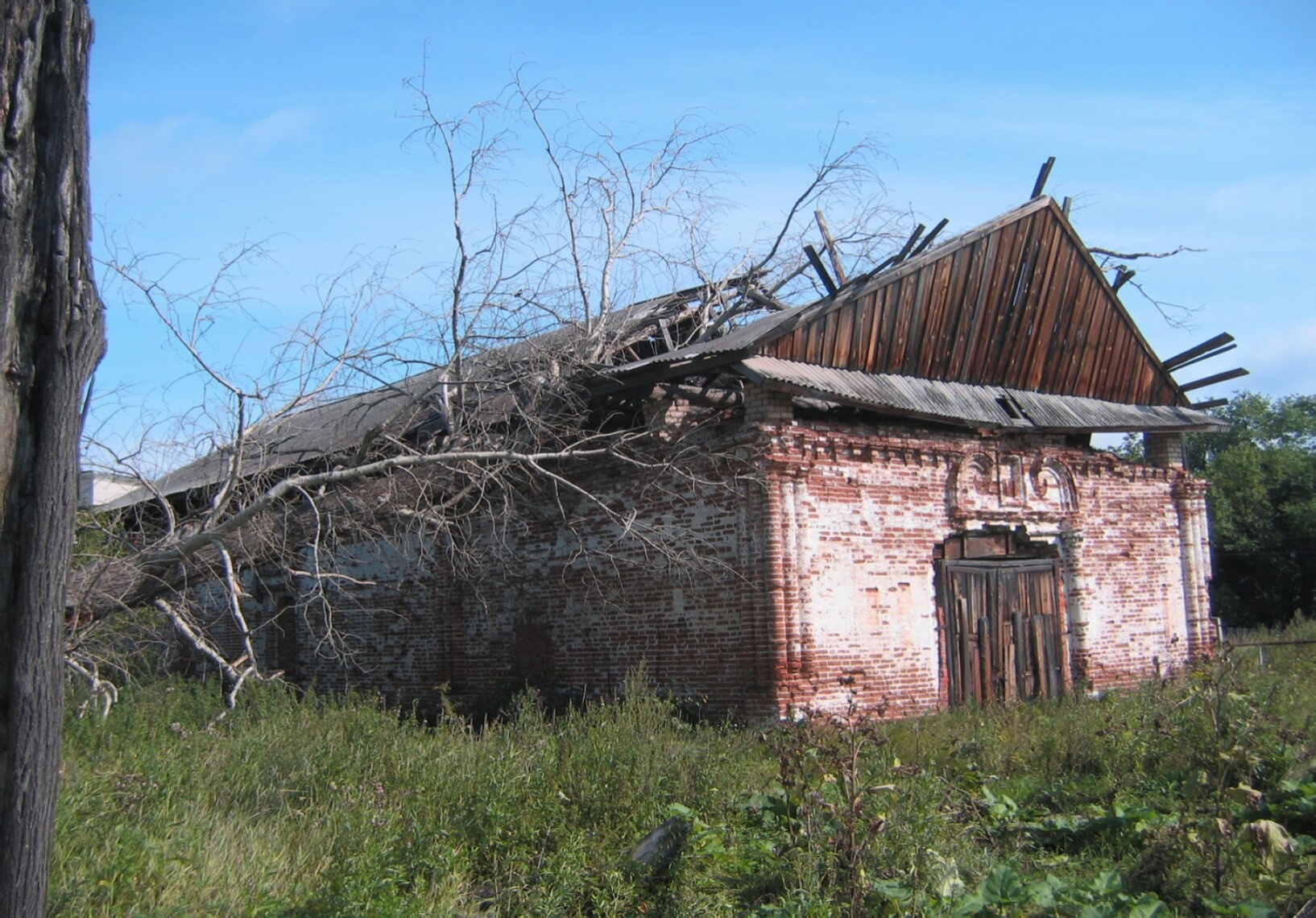 На представленной фотографии запечатлена Церковь во имя святого Пророка, Предтечи и Крестителя Господня Иоанна, расположенная в исторической части города Верхотурья Свердловской области. Храм находится в полуразрушенном состоянии, что придаёт его облику особую духовную значимость и напоминает о сложных периодах в истории русского православия.