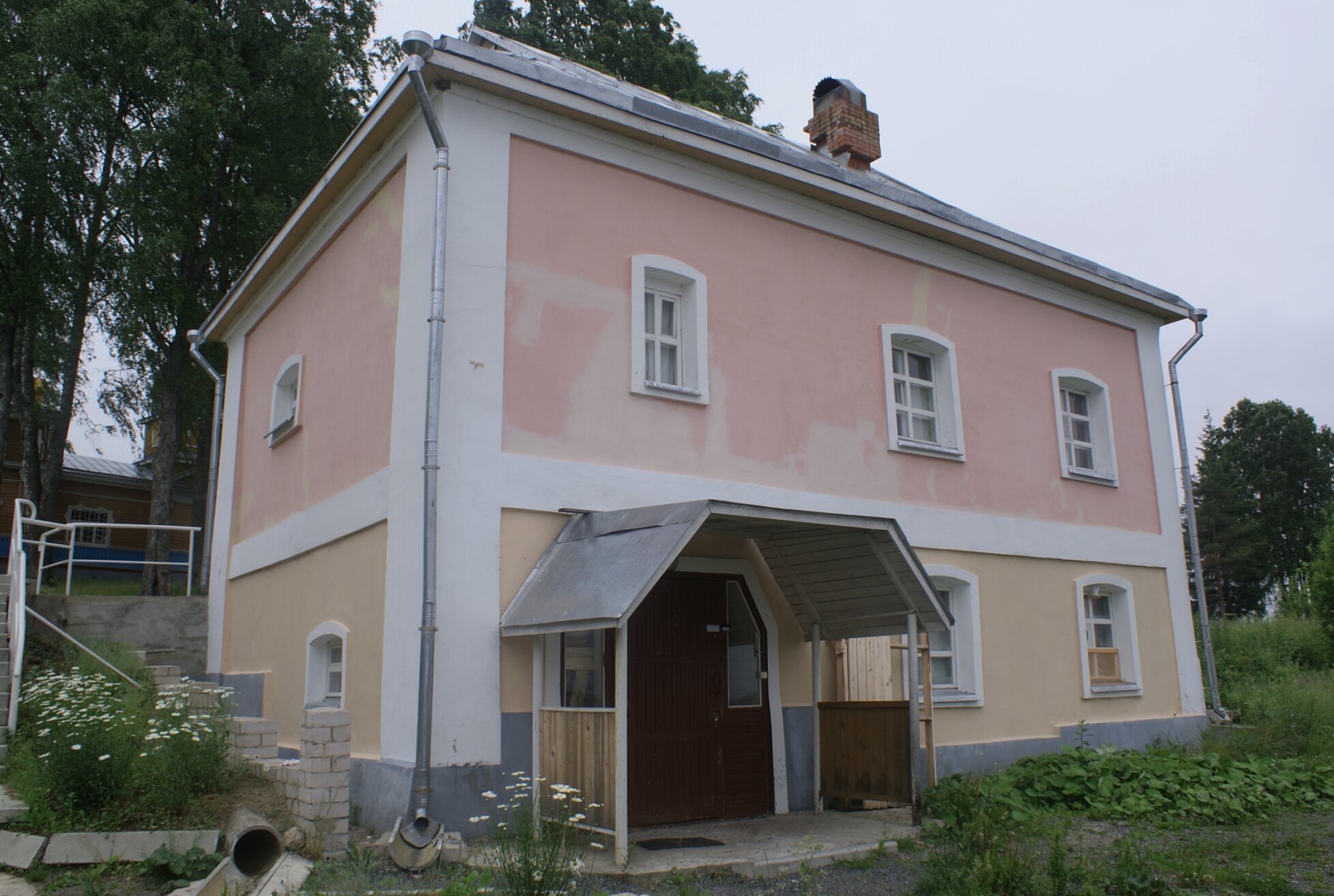 На фотографии запечатлена надвратная церковь во имя преподобного Иоанна Рыльского, расположенная в Важеозерском Спасо-Преображенском мужском монастыре в посёлке Интерпосёлок Республики Карелия. Этот деревянный храм был построен в период с 1896 по 1898 год и является частью исторического монастырского ансамбля.