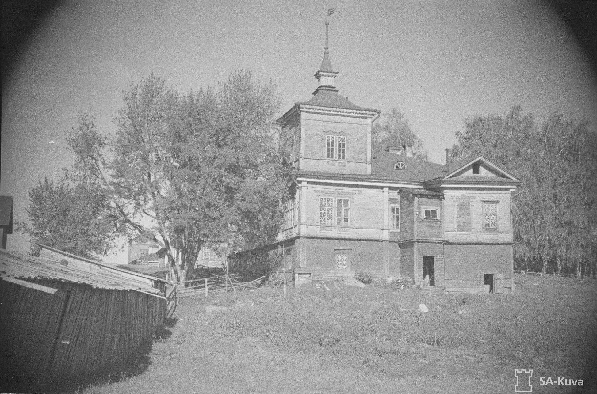 Чёрно-белое изображение, помеченное архивным знаком "SA-Kuva", сохранило для потомков облик утраченного ныне храма, являющегося частью духовного наследия Русского Севера. Эта фотография служит ценным историческим документом, свидетельствующим о богатых традициях православного монастырского строительства в Карелии.