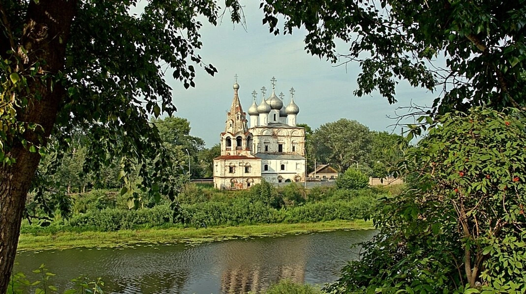 На представленной фотографии запечатлен величественный православный храм во имя святителя Иоанна Златоуста, расположенный в исторической части города Вологды на живописном берегу реки Вологды. Церковь представляет собой выдающийся памятник русского церковного зодчества, построенный в 1664 году.