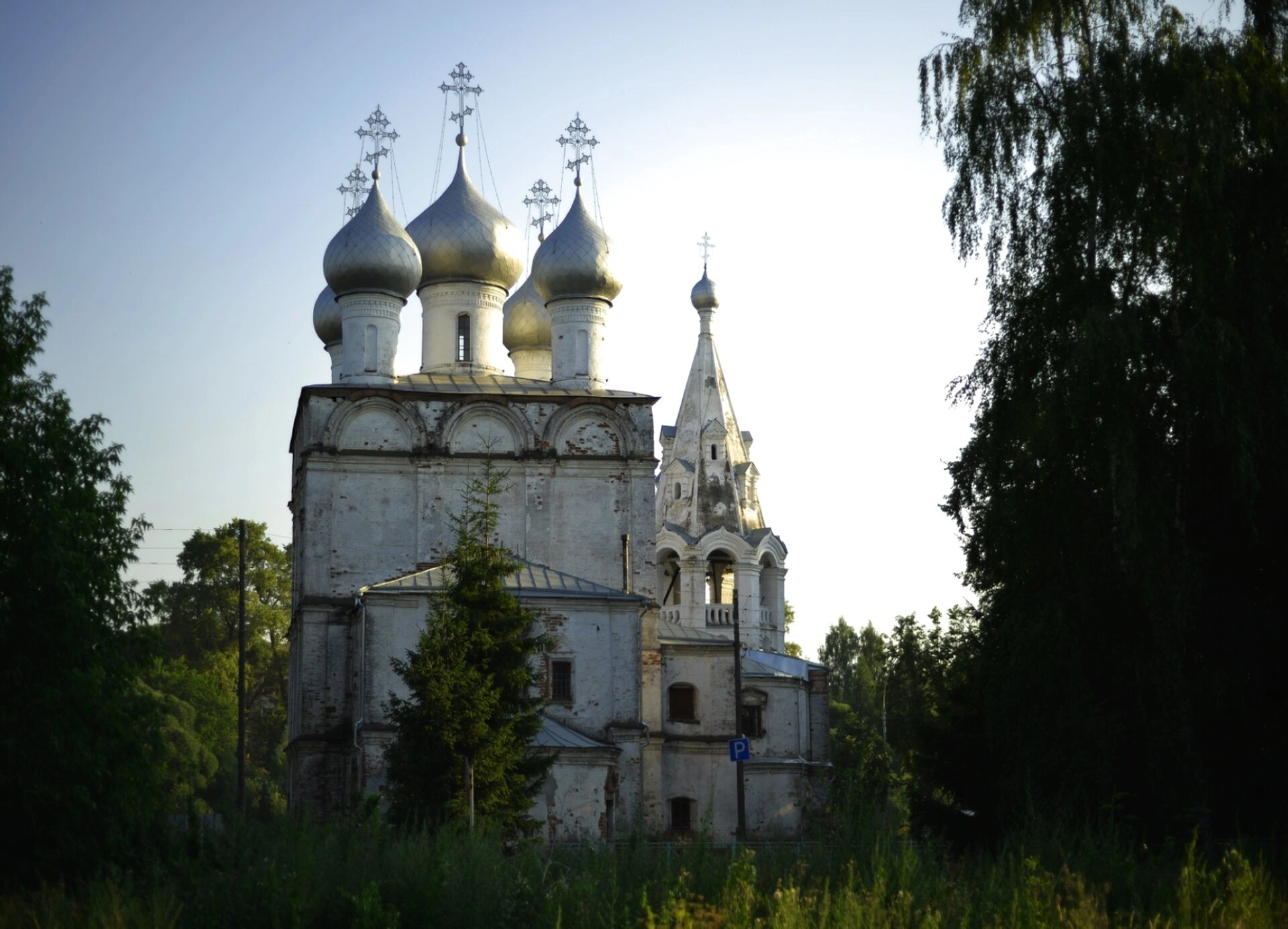На представленной фотографии запечатлён старинный православный храм — Церковь во имя Святителя Иоанна Златоуста, что на бывшем Горне-Успенском погосте в Вологде. Это каменная пятиглавая церковь, являющаяся ярким образцом русского церковного зодчества второй половины XVIII века. Её серебристые купола, увенчанные благодатными крестами, и стройная колокольня, устремлённая в небеса, создают величественный образ, гармонично вписанный в природный ландшафт.