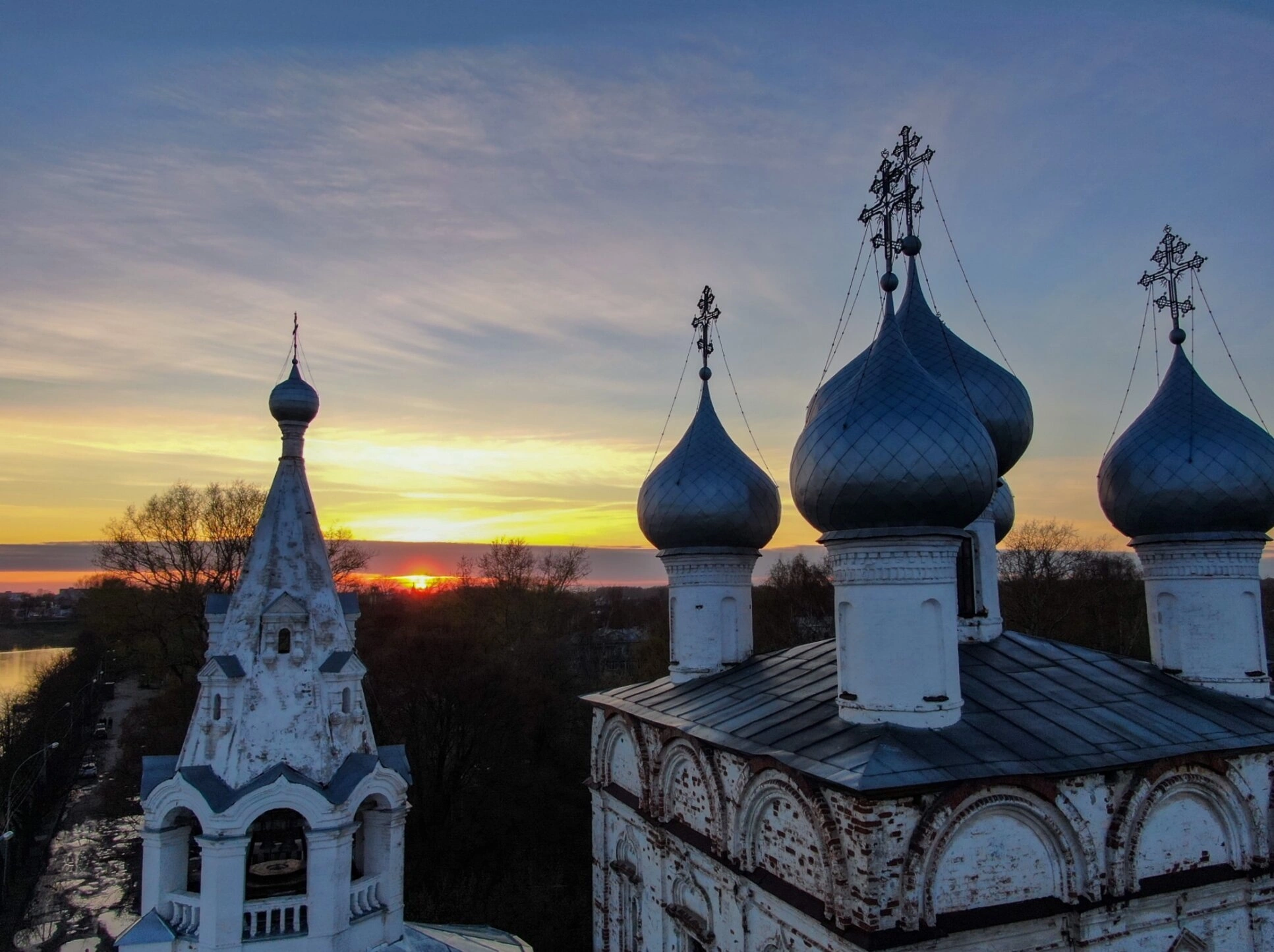 На представленной фотографии запечатлена Церковь Иоанна Златоуста, расположенная в исторической части Вологды. Снимок выполнен в час заката, когда последние лучи солнца мягко освещают величественные купола храма, создавая особую духовную атмосферу.