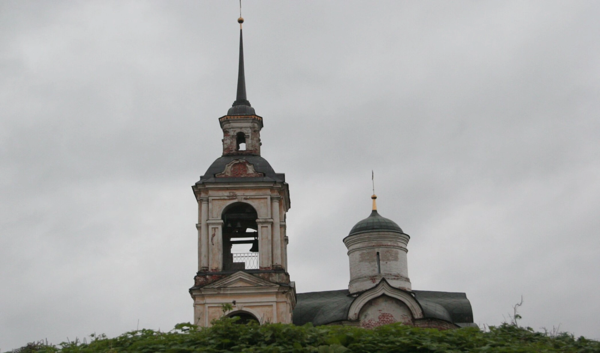 Церковь расположена на невысоком холме, частично скрытая разросшейся зеленой растительностью на переднем плане. Пасмурное небо с облаками создает особую атмосферу умиротворения и покоя, характерную для северных русских пейзажей. Отсутствие людей на снимке позволяет сосредоточить внимание на архитектурных достоинствах этого православного святилища.