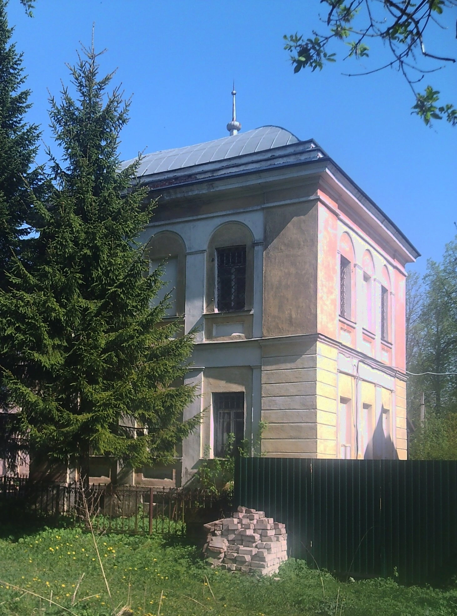 Здание представляет собой двухэтажную постройку с арочными и прямоугольными окнами. Фасад выполнен в сдержанных пастельных тонах, сочетает оштукатуренные и окрашенные участки, а также декоративные элементы из светлого камня. На крыше виден небольшой купол, увенчанный изящным шпилем, что характерно для православного зодчества.