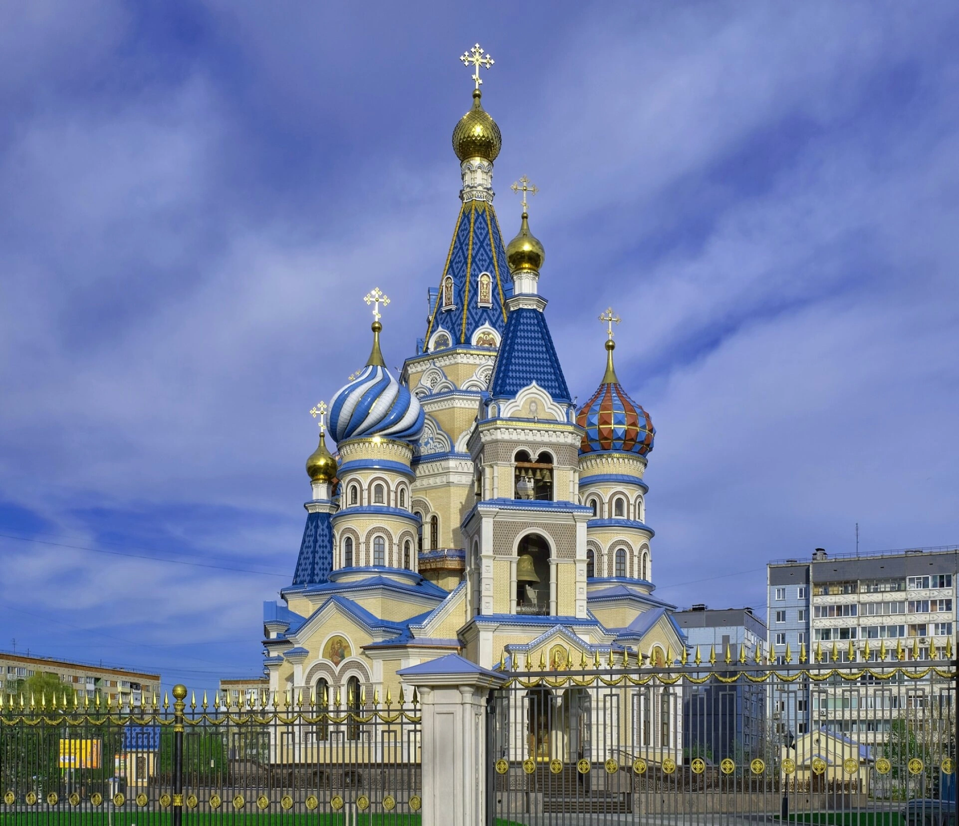 На представленной фотографии запечатлён величественный православный храм — Церковь Иверской иконы Божией Матери, находящаяся в городе Ижевске. Это святое место является одной из ярких духовных и архитектурных достопримечательностей региона, привлекающей верующих и ценителей церковного зодчества.