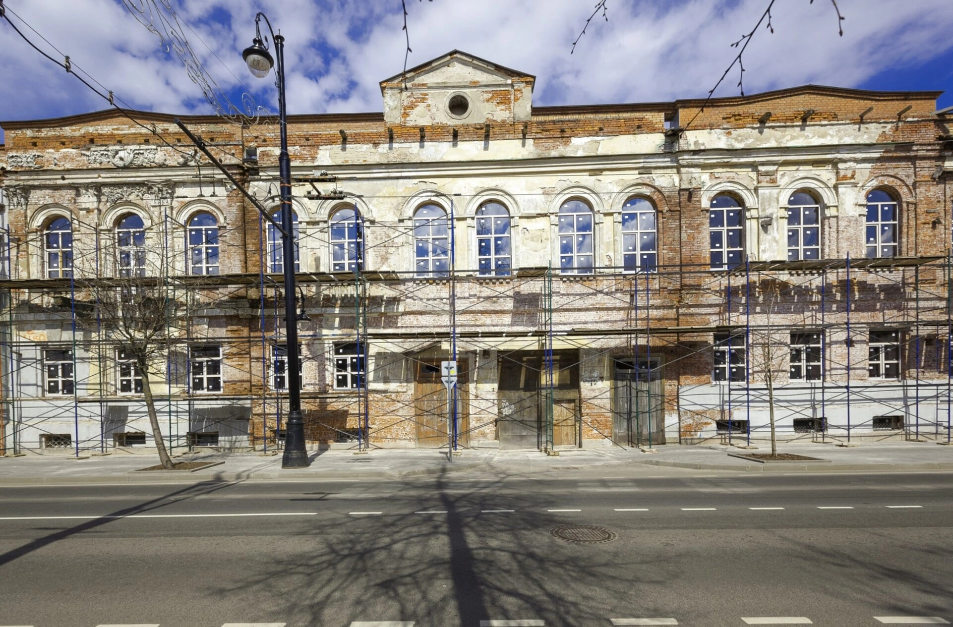 На представленной фотографии запечатлена Церковь Иверской иконы Божией Матери, расположенная в исторической части города Рыбинска Ярославской области. Храм находится в процессе реставрации, о чём свидетельствуют строительные леса, установленные вдоль фасада здания.