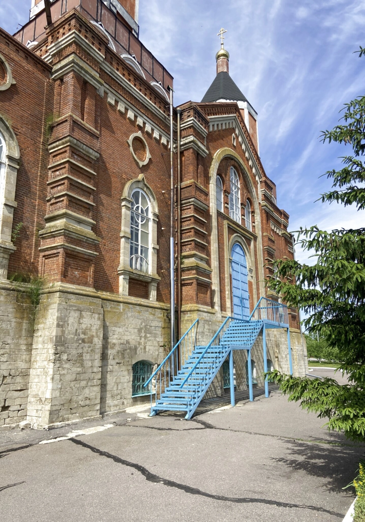 Главный портал храма украшен богатым декоративным оформлением, включающим полуциркульные арки, ритмичные кирпичные узоры и контрастные белые элементы, подчёркивающие архитектурные линии. Ко входу ведут прочные синие металлические лестницы, гармонично сочетающиеся с общим цветовым решением фасада. Арочные окна, характерные для неороманского стиля, обрамлены декоративной кирпичной кладкой, формирующей архивольты, что придаёт зданию особую выразительность и монументальность.
