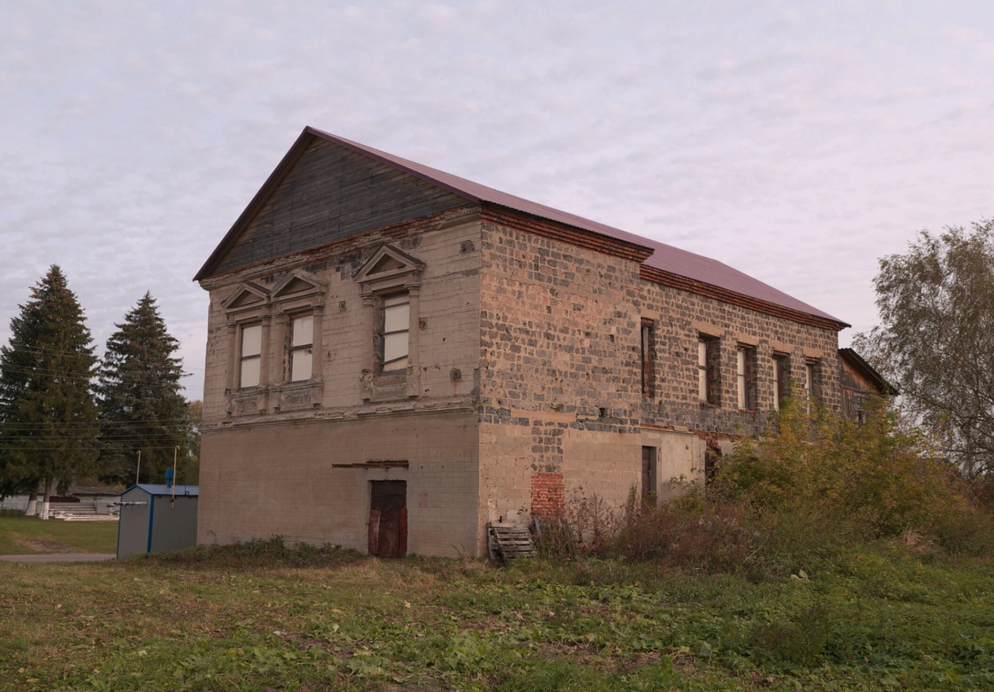 По обе стороны от входа установлены два чёрных уличных фонаря, а справа от здания растёт молодое дерево с зелёной листвой. На заднем плане слева видны крыши других строений, что подчёркивает сельский характер окружающей местности. Трава на переднем плане зелёная, что свидетельствует о тёплом времени года.