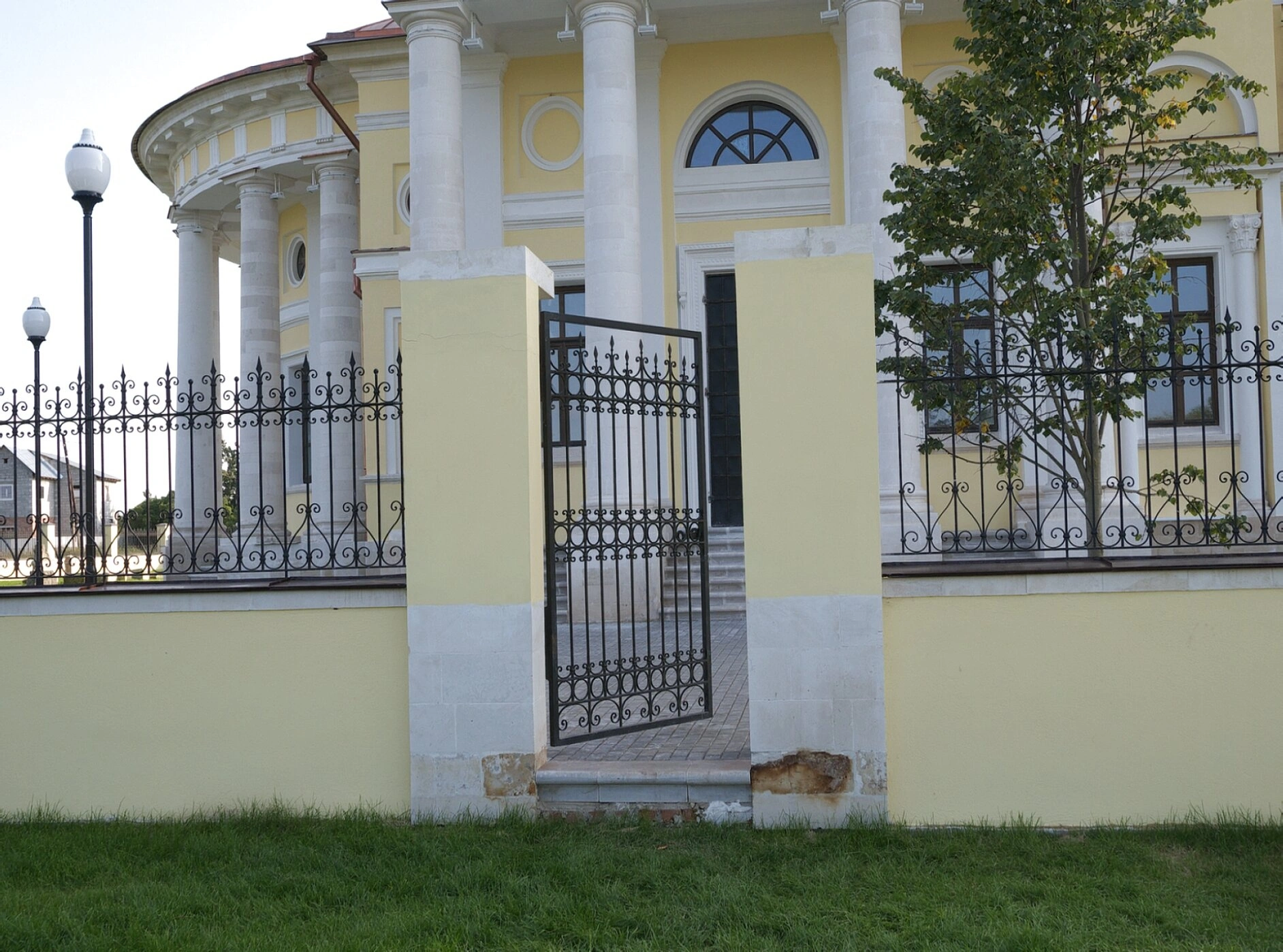 Перед церковью находится невысокая ограда из светлого камня, увенчанная чёрной кованой решёткой с изящными декоративными элементами. В центре ограды расположена открытая кованая калитка, фланкированная двумя массивными столбами того же оттенка. За калиткой просматривается лестница, ведущая к входу в храм.