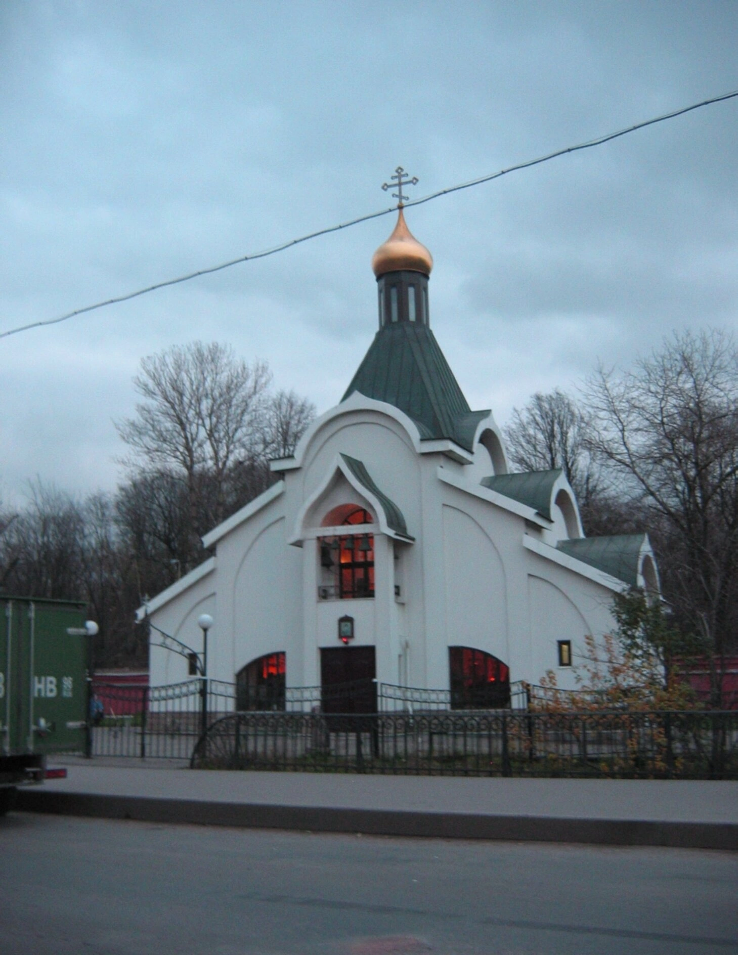 На заднем плане фотографии видны деревья, лишённые листвы, что позволяет предположить, что съёмка проводилась в осенне-зимний период. Слева от церкви частично виден зелёный грузовой контейнер с маркировкой «3 НВ», что свидетельствует о городском контексте расположения храма.