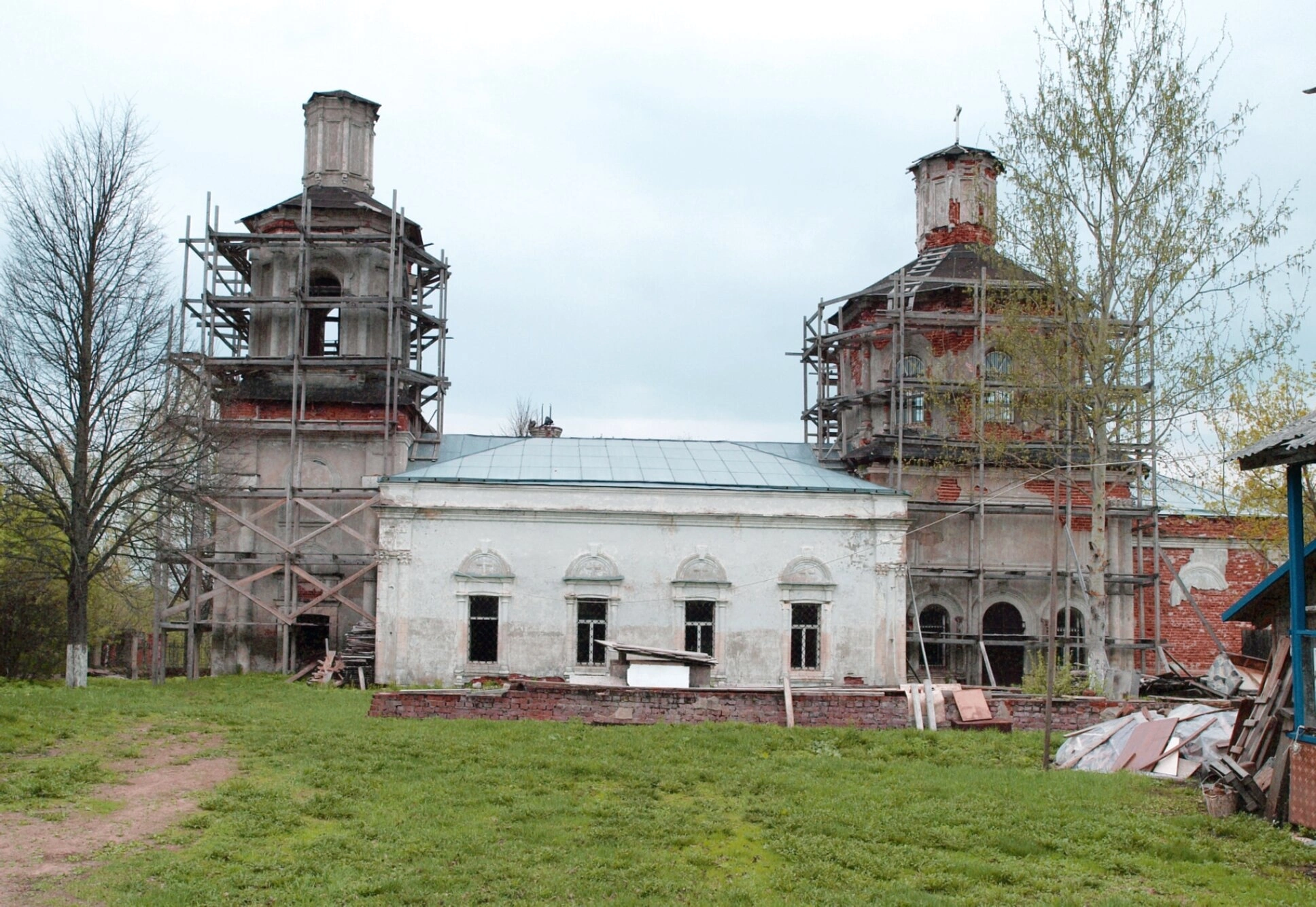 В момент съёмки святыня пребывает в благодатный период реконструкции, о чём красноречиво свидетельствуют установленные строительные леса, опоясавшие её колокольню и основные объёмы. Это зримое свидетельство заботы о возвращении былого благолепия домому Божиему. Основной материал постройки — красный кирпич, часть стен которого оштукатурена и побелена, что придаёт храму нарядный и светлый вид, в то время как другие участки сохраняют аутентичную кирпичную кладку, рассказывающую о его истории.