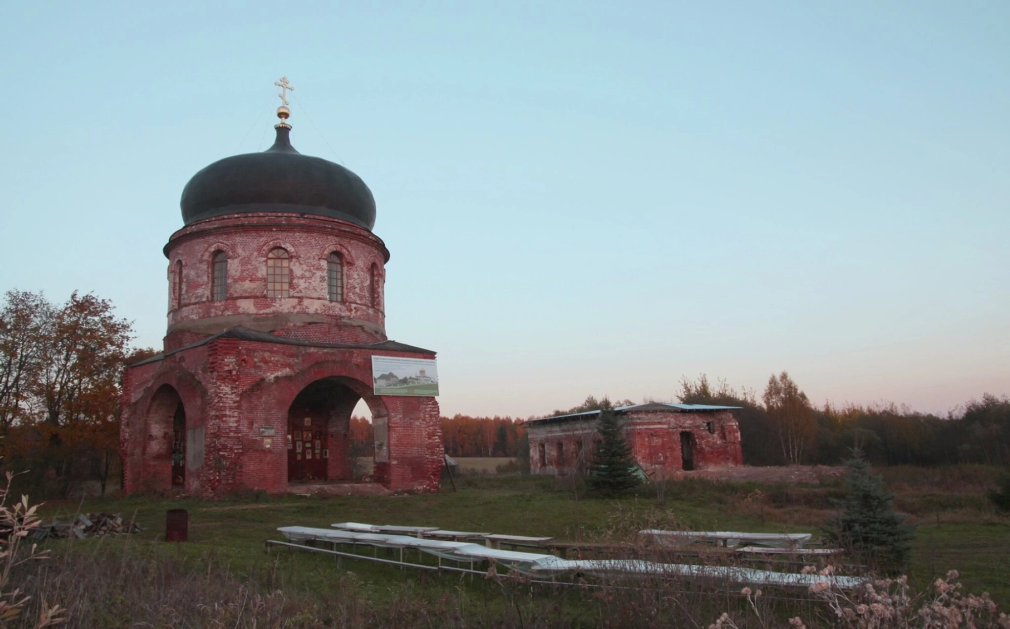 На снимке здание предстаёт в осенних или ранних зимних сумерках. Стены из красного кирпича несут следы разрушительного действия времени и запустения. Пожухлая трава и молодые ели, окружающие храм, подчёркивают ощущение скорбного забвения. На переднем плане виднеются деревянные скамейки, тронутые инеем или первым снегом, что добавляет кадру лирическую и трогательную атмосферу. Чистое небо на заднем плане символически напоминает о вечной надежде на возрождение.