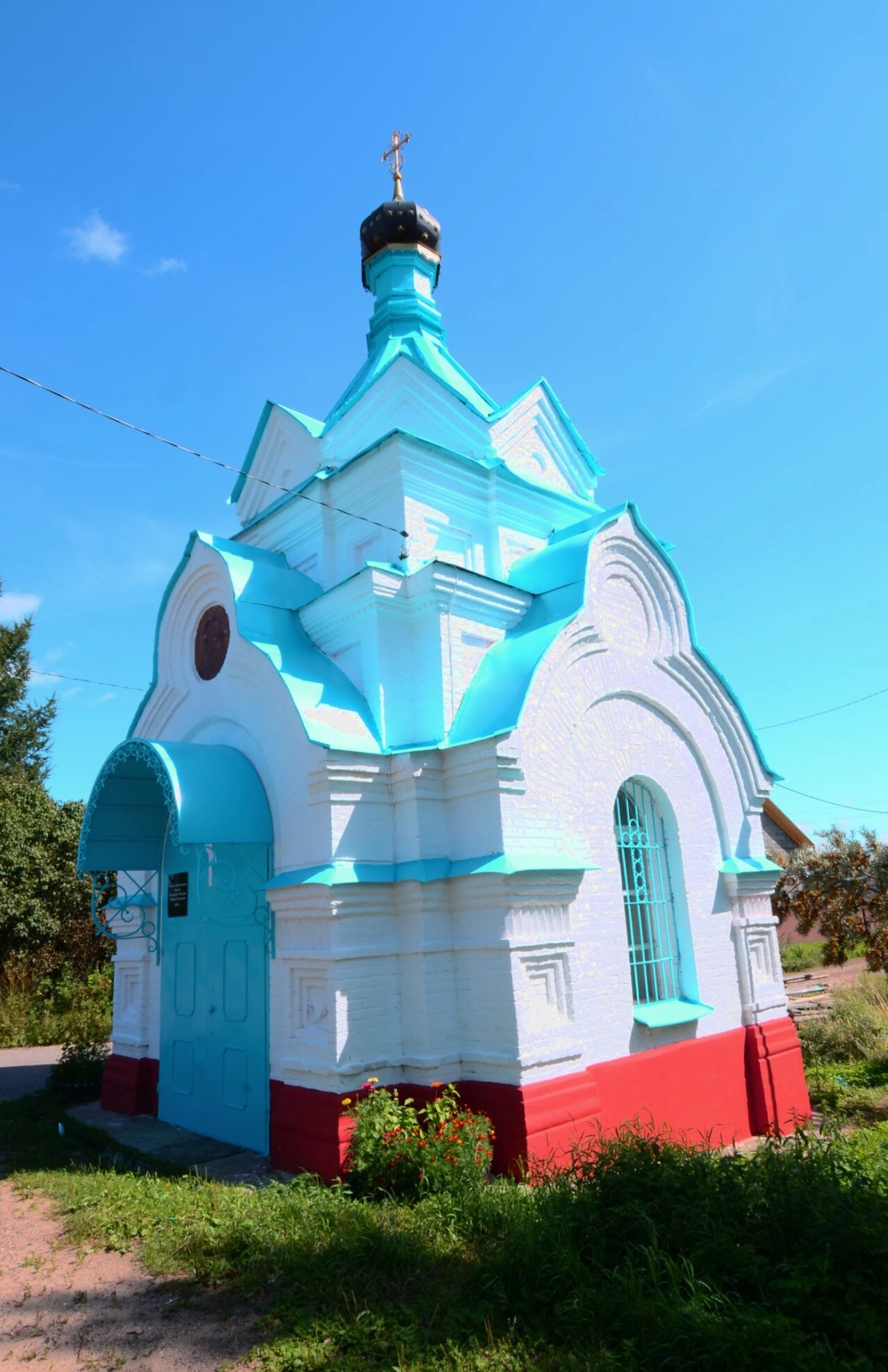 На снимке храм предстаёт в погожий летний день — лазурное небо с легкими облаками создаёт торжественный фон для церковного строения. Сочная зелень травы и окружающих деревьев подчеркивает ухоженность территории и гармоничное вписывание святыни в природный ландшафт.