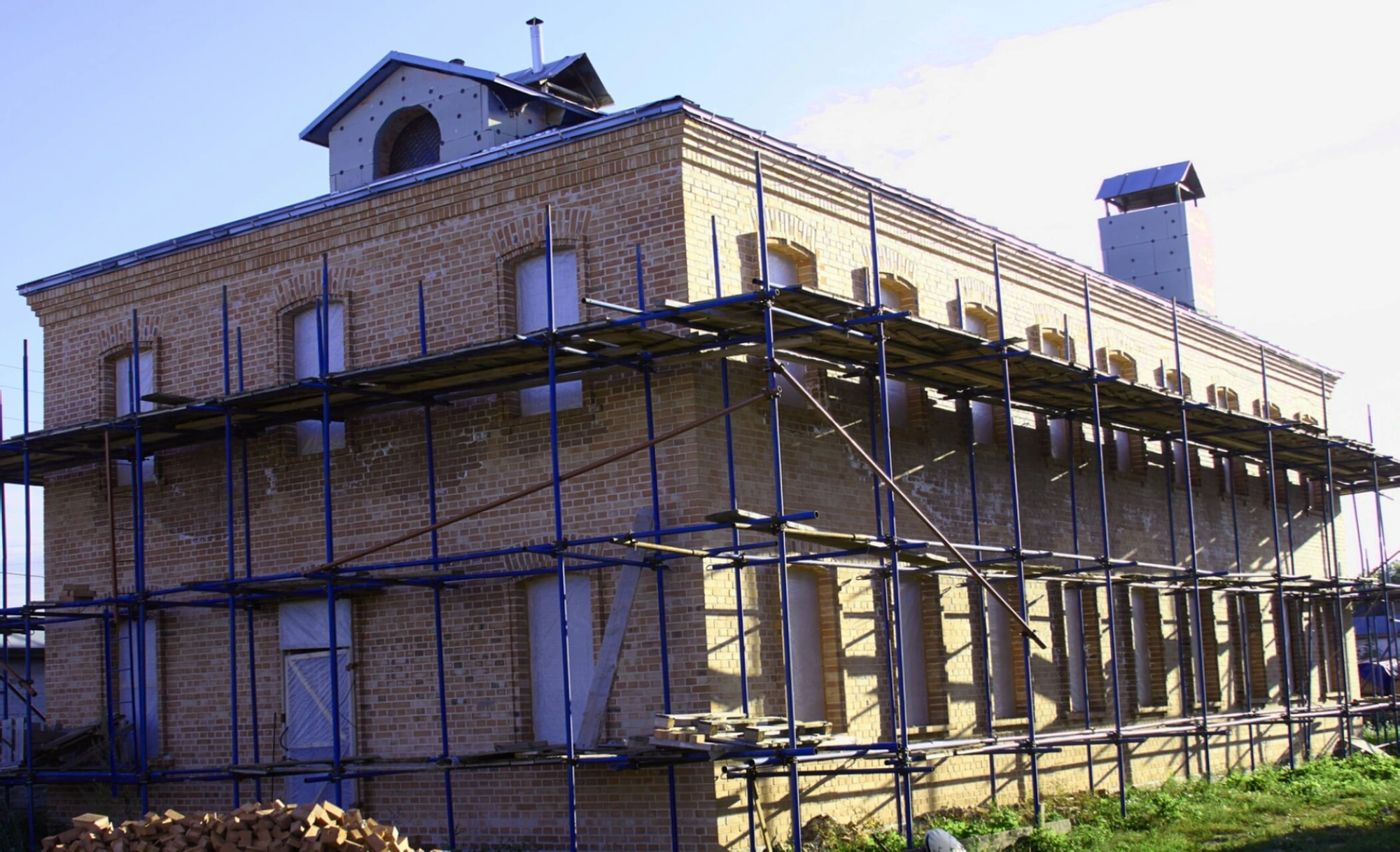 Двухэтажное кирпичное строение демонстрирует характерные черты церковной архитектуры с арочными оконными проёмами. На первом этаже оконные проемы временно закрыты защитными материалами, в то время как на втором этаже окна представлены без стеклянного заполнения. Кирпичная кладка сохраняет следы времени, но отдельные участки показывают признаки недавнего восстановления.
