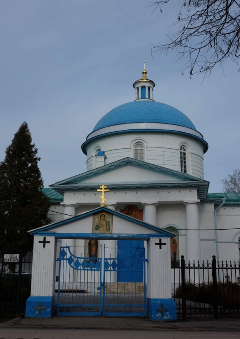 Основное здание храма отличается изящными пропорциями и гармоничным сочетанием белоснежных стен с лазурными элементами. Центральный объем венчает величественный синий купол, увенчанный золоченым крестом, символизирующим победу Христа над смертью. Фасад украшен классическими колоннами и завершается треугольным фронтоном, что придает сооружению особую торжественность.