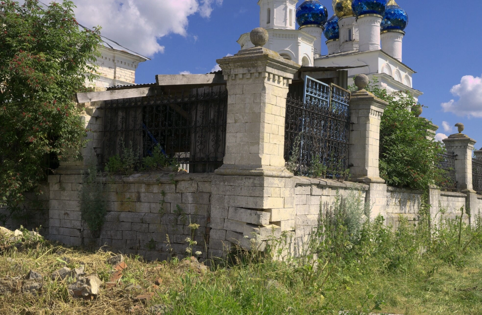 На снимке хорошо просматривается монументальная каменная ограда с элементами художественной ковки, окружающая церковную территорию. Ограда демонстрирует характерные для церковного зодчества элементы: каменные столбы с декоративными завершениями и ажурные металлические вставки. Состояние ограждения свидетельствует о почтенном возрасте сооружения, что придаёт ему особую историческую ценность.