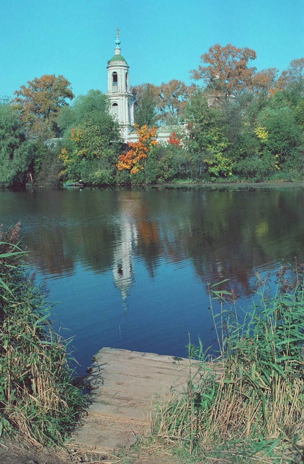 На представленной фотографии запечатлён величественный образ Церкви Казанской иконы Божией Матери, расположенной в селе Кленково Клинского района Московской области. Храм возвышается на живописном берегу, его белоснежные стены и изумрудный купол гармонично сочетаются с окружающим осенним пейзажем.