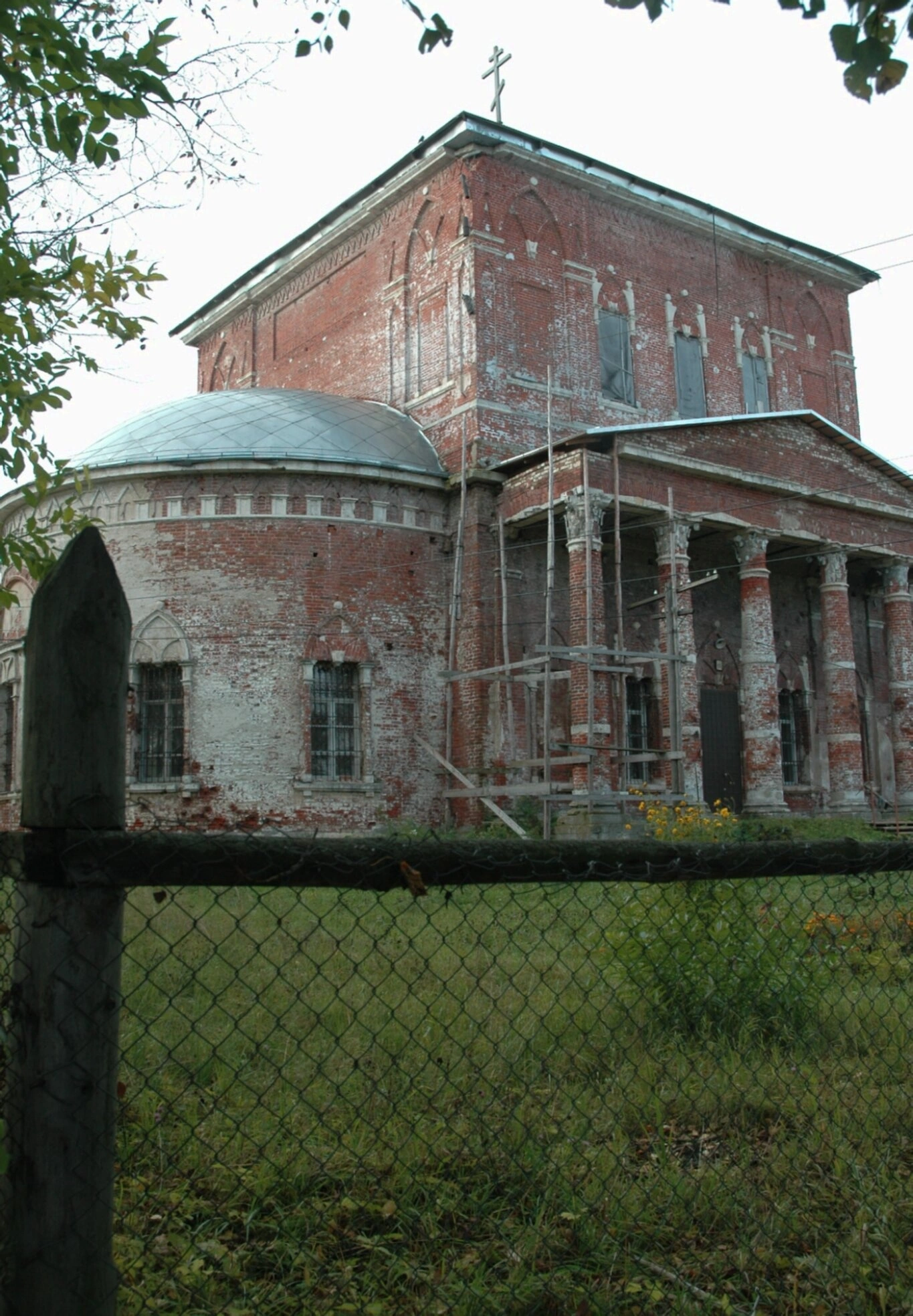 Архитектурная композиция храма включает полукруглый придел, увенчанный купольным завершением, который расположен в левой части здания. На кровле основного объёма сохранился православный крест — символ веры и надежды на возрождение этой святыни. На переднем плане фотографии видны элементы окружающего ландшафта: сетчатое ограждение и заросли полевых трав, что подчёркивает заброшенное состояние территории.