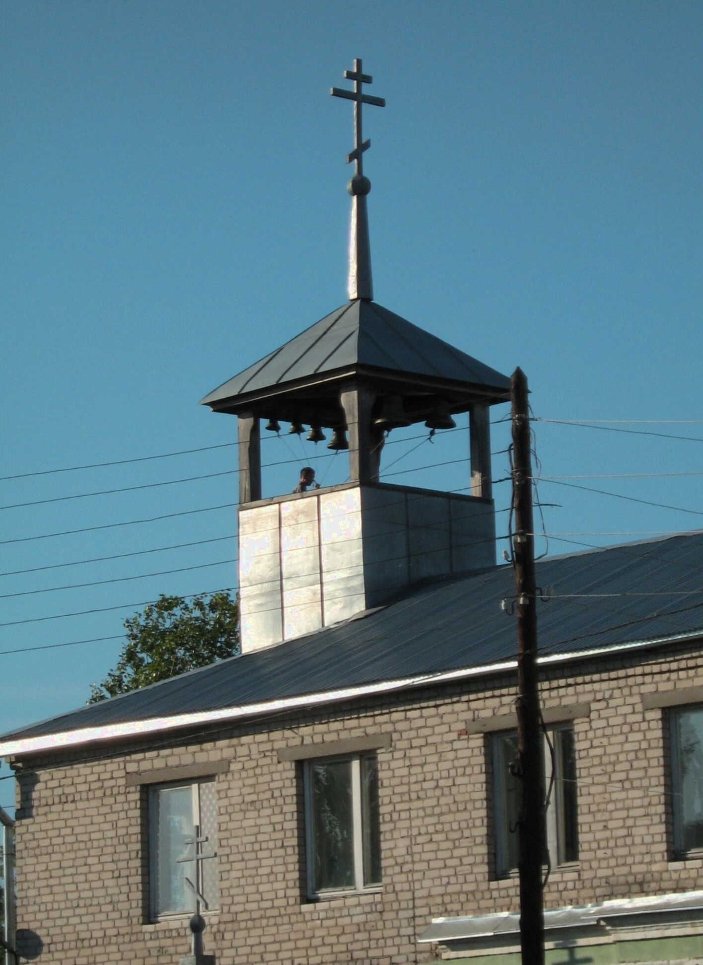 На представленной фотографии запечатлена колокольня Церкви Казанской иконы Божией Матери, расположенной в городе Кстово Нижегородской области. Святыня, увенчанная православным крестом, является историческим и духовным центром данного края.