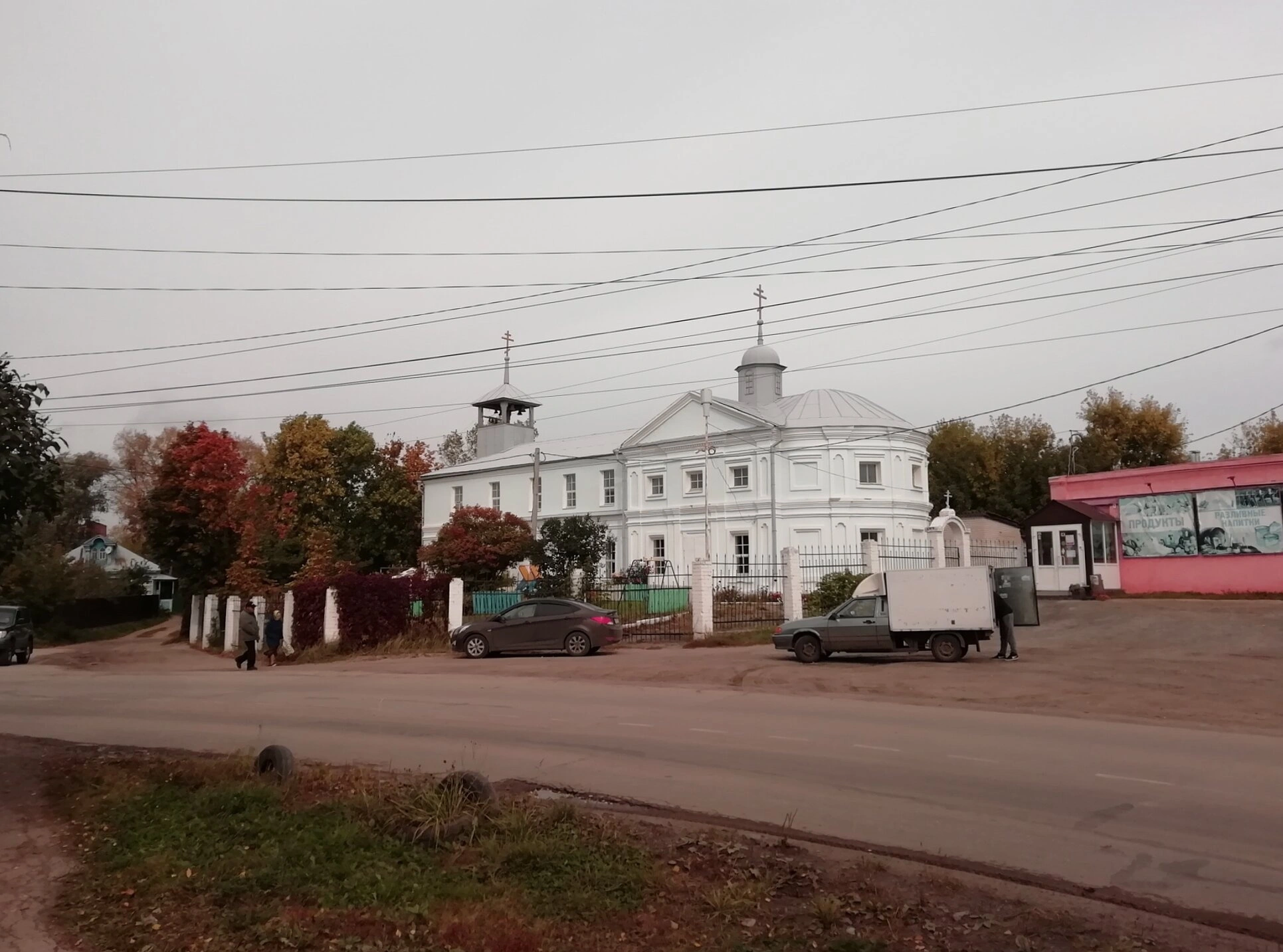 Святыня находится в исторической части города, о чём свидетельствует её расположение в окружении городской застройки. Осенние деревья с пожелтевшей листвой обрамляют церковный двор, создавая умиротворённый образ. На переднем плане видна прихрамовая территория с ограждением, а также проезжая часть, что указывает на интеграцию храма в современную городскую среду.